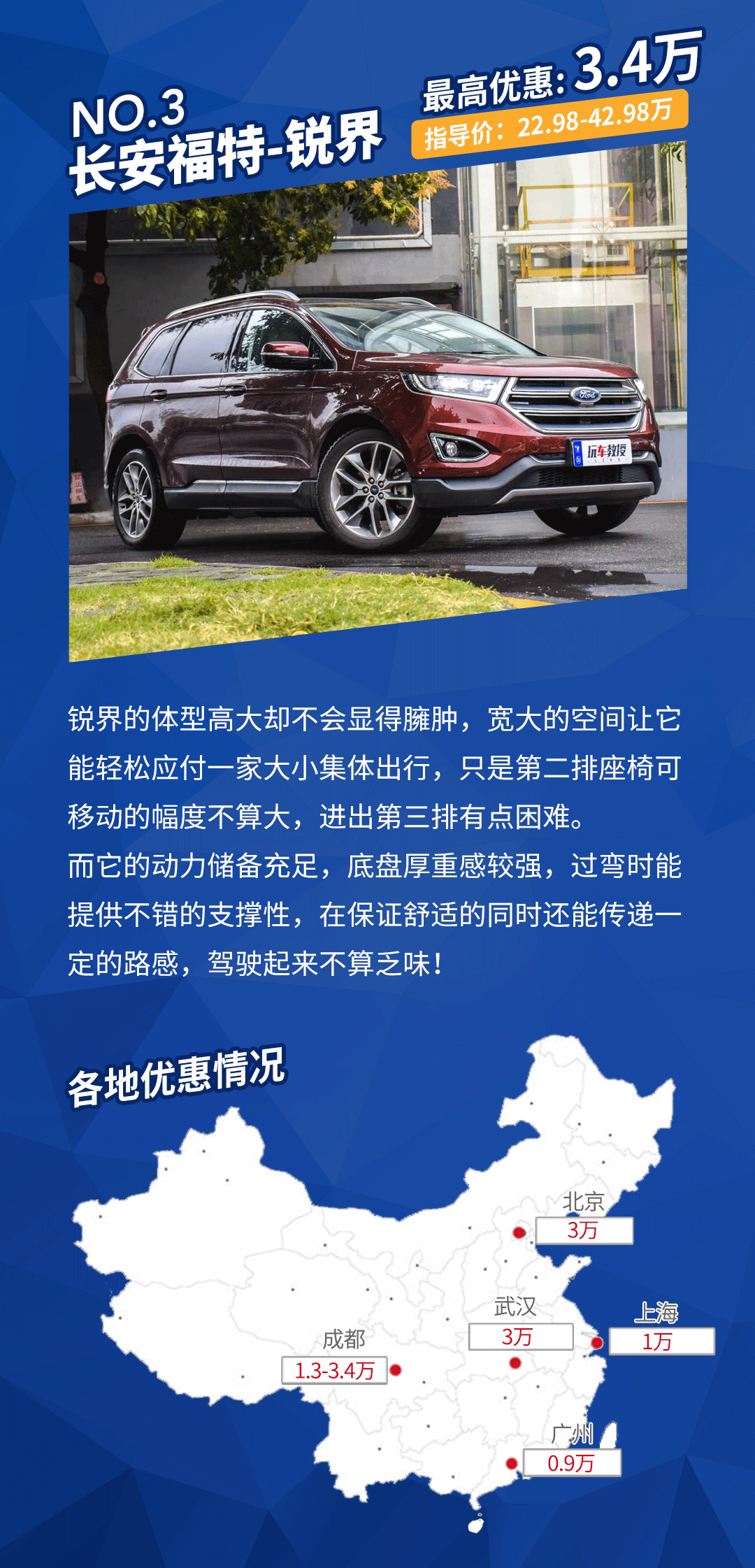 车型点评:锐界的下来一直不错,国内消费者对于这一类7座SUV车型的青睐程度较高,而且它在行驶舒适性上可圈可点。在成都、广州、上海地区给出的优惠幅度还不错,并且搭配的消费项目不多。