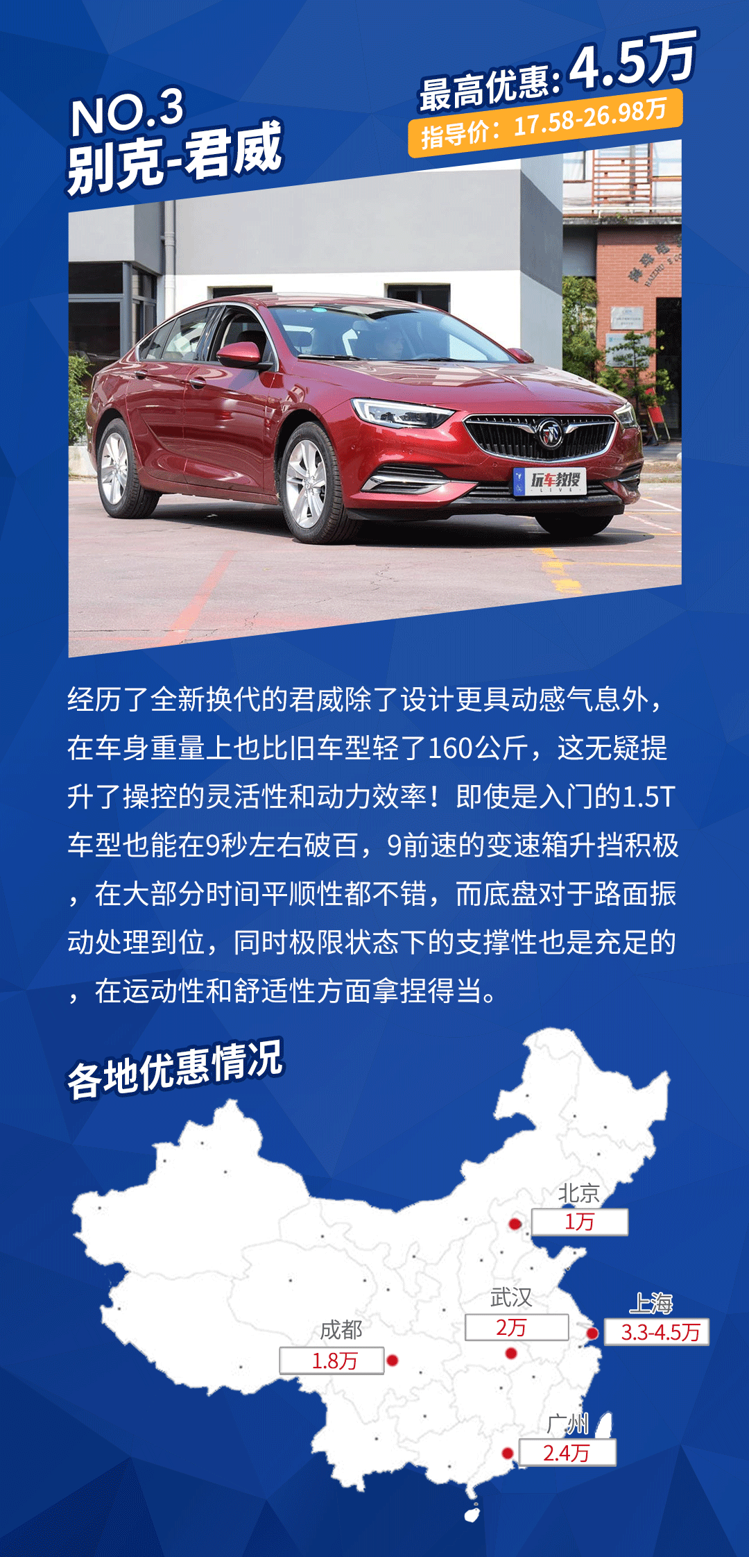 车型点评:在图上的大部分城市君威都给出了现金直接优惠,咱们对于它的让利幅度一目了然,并且优惠幅度很还真的不少!在广州、上海、成都等地区的朋友可以多考虑一下它。