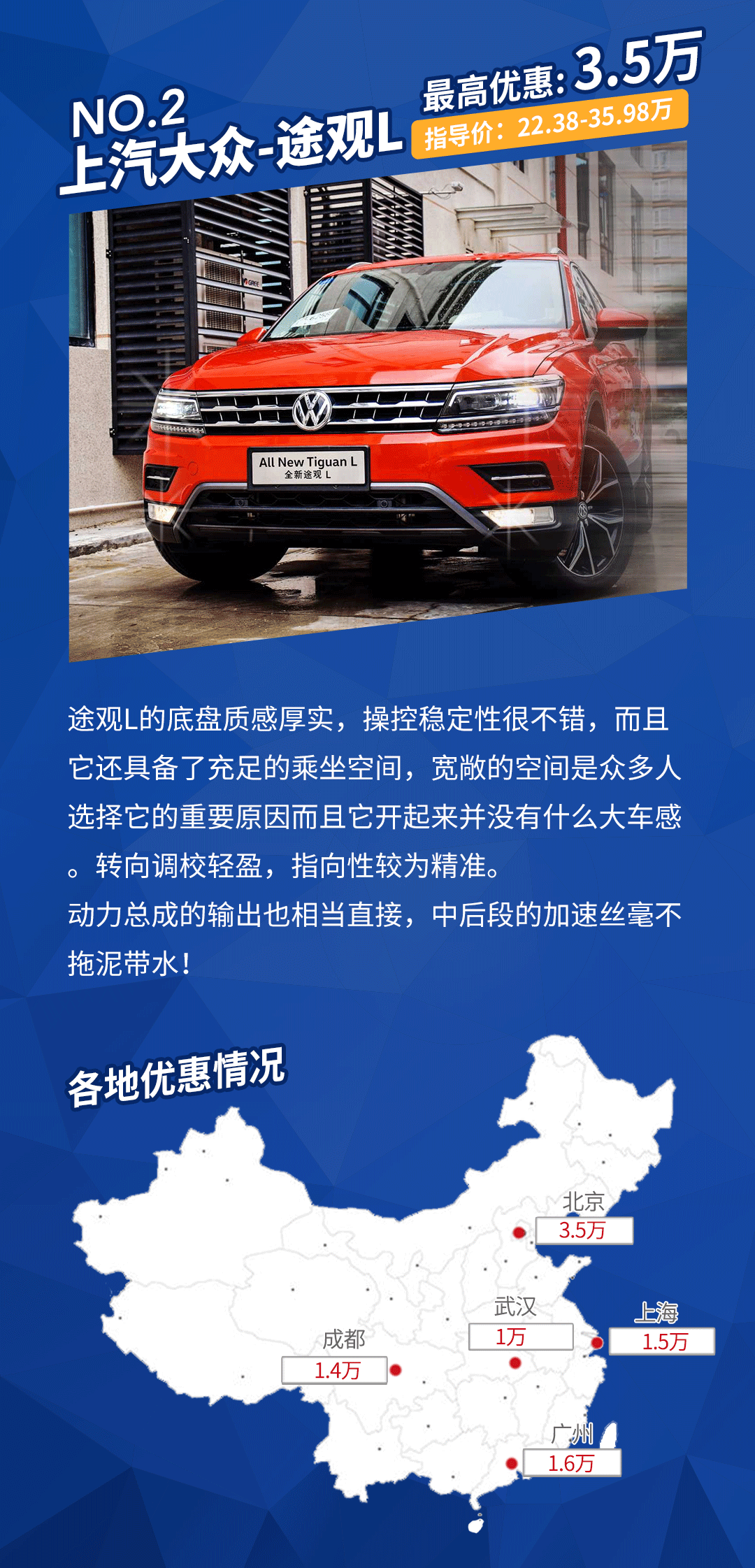 车型点评:途观L的销量一直表现强势,加上大众的品牌加成,所以让利幅度不算大。在广州、成都地区的朋友可以多去了解这款车型。