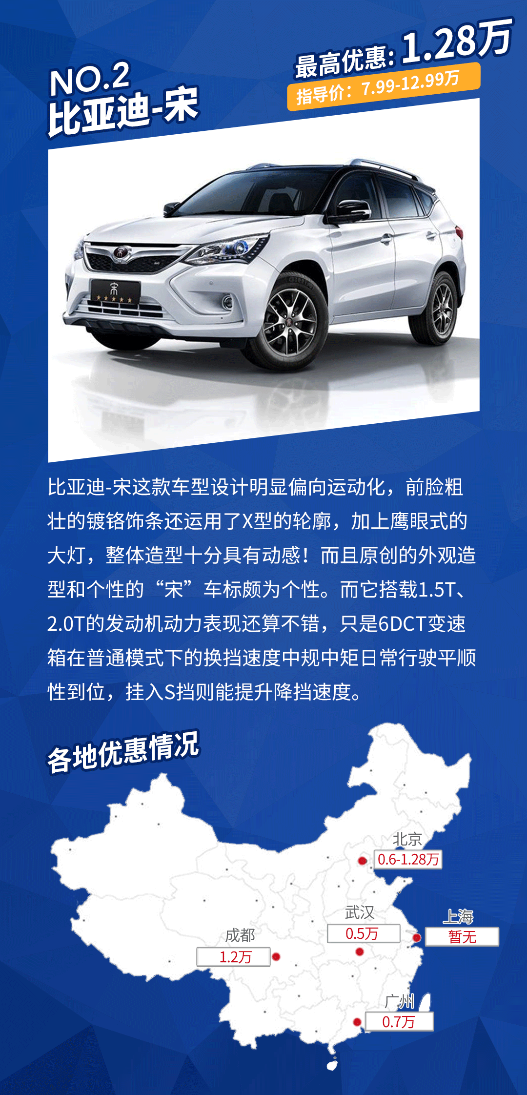 车型点评:在成都和北京的朋友们可以多去留意宋这款车型,因为它的车价较低而且1.2万的优惠幅度已经颇为吸引!