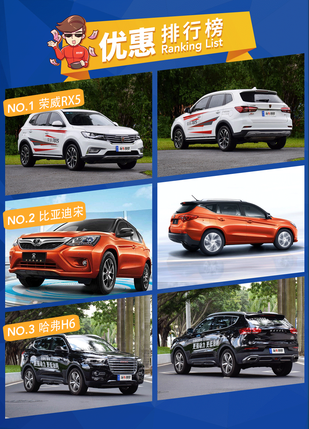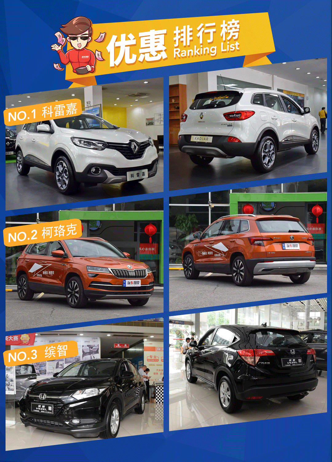 我们可以看出关注度特别高的车型让利幅度相对会小一些,就像哈弗H6、本田缤智这两款车型,市场占有率高,而且颇受消费者追捧,让利幅度会小一些!所以像科雷嘉、荣威RX5等优惠较大的车型我们可以多多考虑。