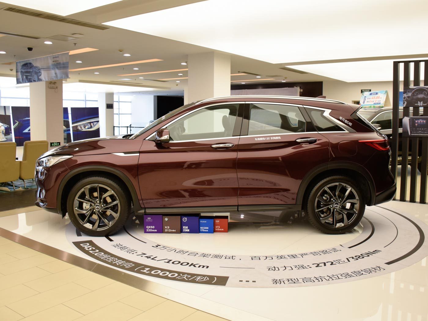 当然,原汁原味的除了尺寸和设计之外,还有动力和底盘。QX50全系搭载全新KR20型2.0T发动机,压缩比可从8:1调整到14:1,采用可模拟阿特金森循环的双循环技术,此外还有缸内直喷和歧管喷射的双喷射技术,简单来说,就像是一个跑步运动员,有些擅长持久的长跑,有些擅长需要爆发的短跑,这个发动机就可以在两者之间切换,实现油耗和动力性能的平衡。其中前驱车型最大马力245PS,四驱车型最大马力272匹,峰值扭矩均为380牛·米。只不过这个传动方面嘛,可能很多人会对CVT颇有微词,我个人觉得CVT确实动力感不足,但它的效率更高也是事实。从结论来说,它的实测百公里成绩可以跑进8s内,动力的表现不算差了,当然,比起同级很多2.0T高功率要逊色不少。