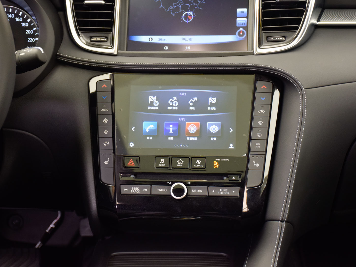 好,我们到车内看看。内饰从一些细节上还是能够看到它对线条的追求,而相对外观而言,内饰更注重氛围和档次的营造,而非运动感,双色的皮革覆盖了整个中控台的95%,从仪表盘一直延伸到扶手箱的这条棕色皮革个人觉得是车内的点睛之笔。