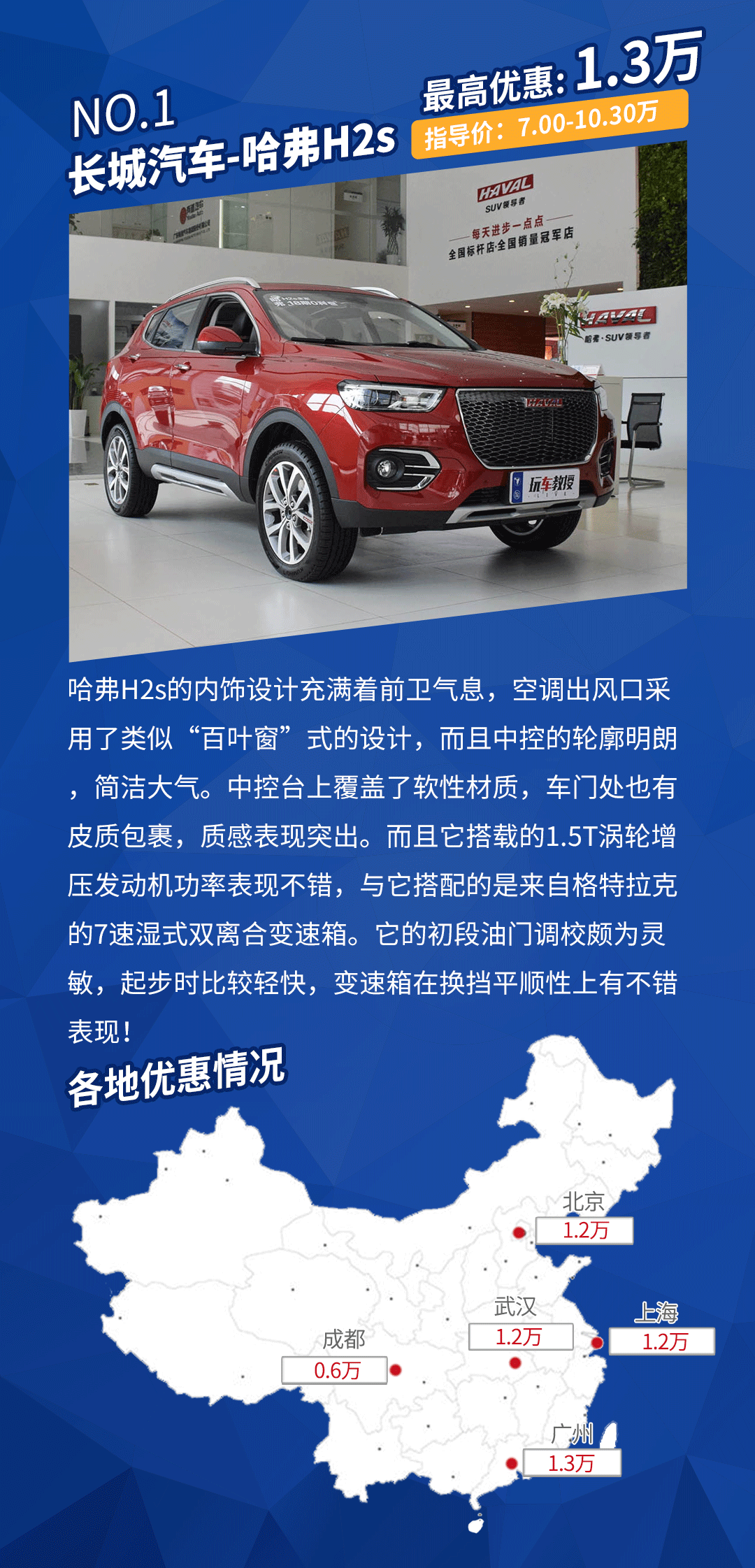 车型点评:其实哈弗H2s的产品品质不低,而且给出了的优惠很是务实!在以上五个城市的朋友们真的可以多去看看这款车型,它在优惠过后十分接地气!