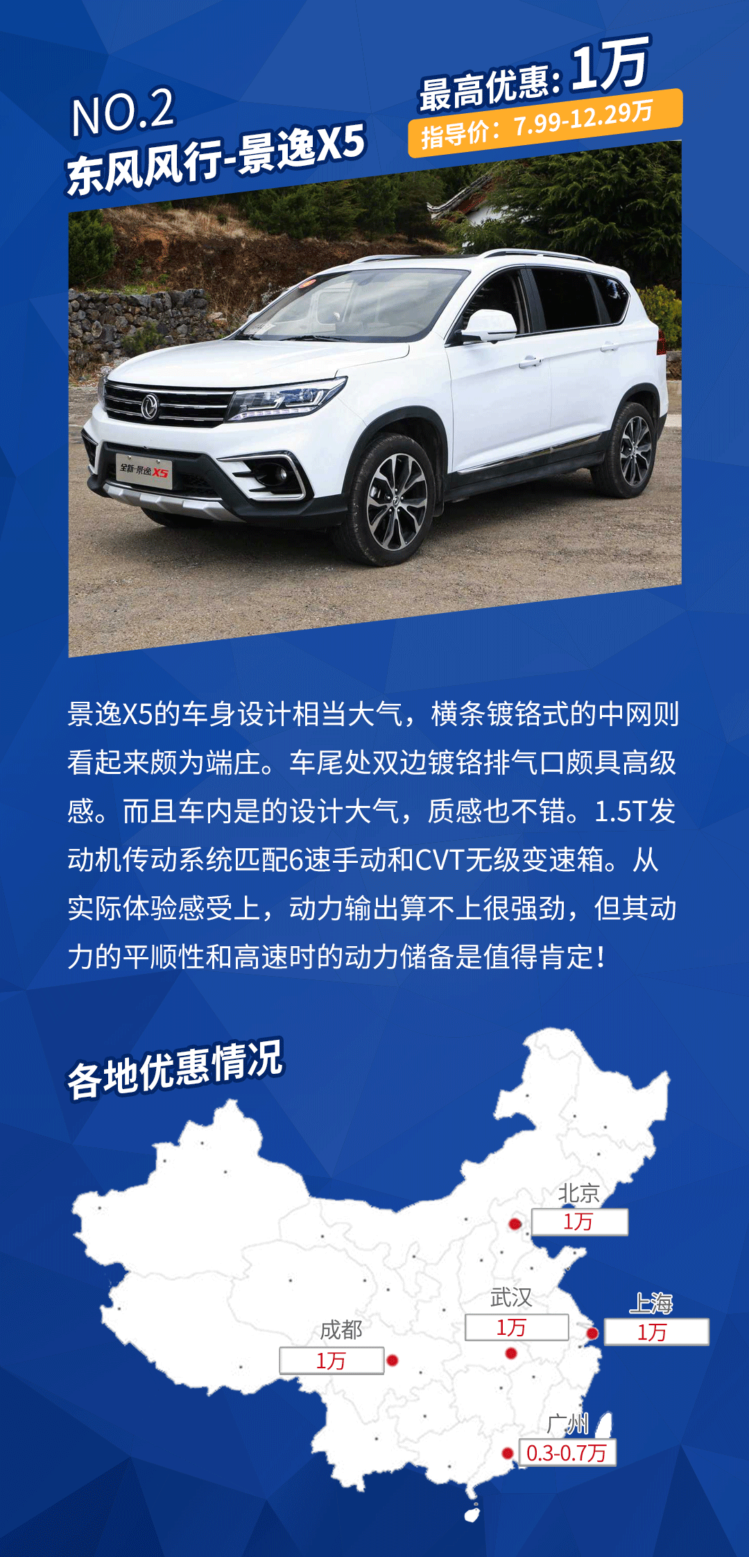 车型点评:景逸X5的外观内饰表现足够大气,而且售价是比较接地气的,在北京、武汉、成都地区有着1万的现金优惠幅度,在这些地区真的颇具吸引力!