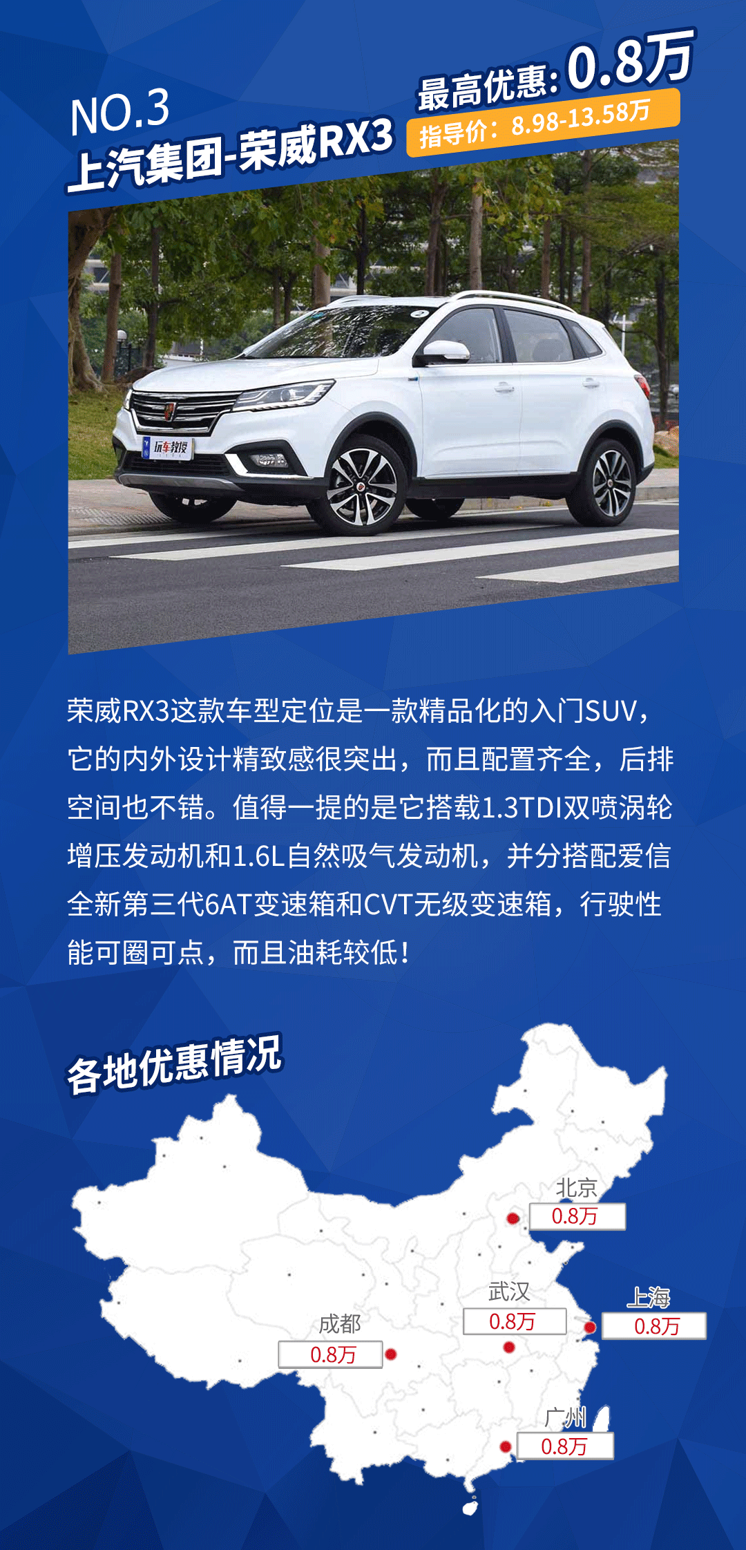 车型点评:荣威RX3的主打的是精致感的SUV市场,它的做工水准颇高而且优惠幅度也不错,值得考虑!