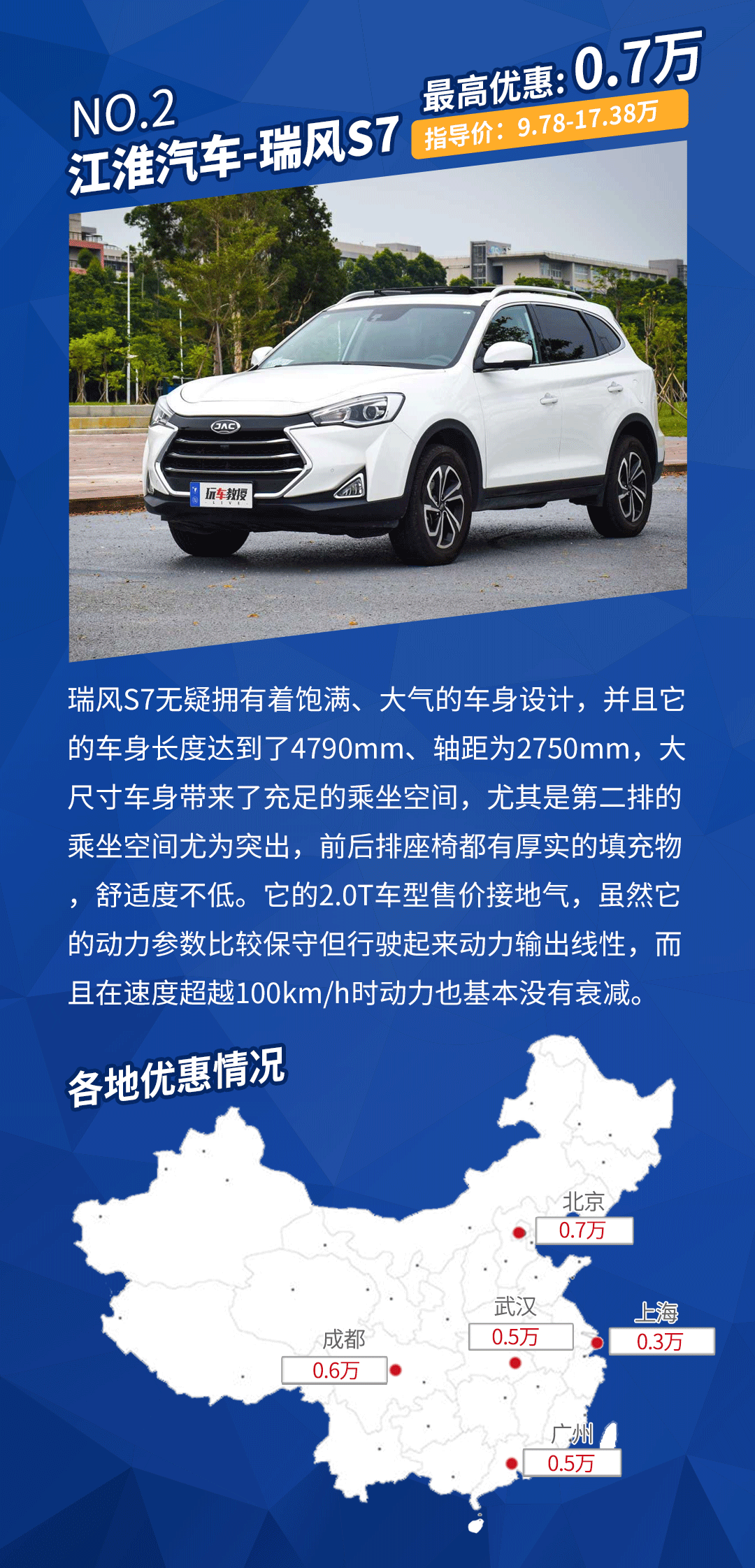 优惠详情:瑞风S7在广州、北京、武汉、成都给出了现金优惠,上海地区需要搭配店内上保险、店内上牌、店内保养等项目。