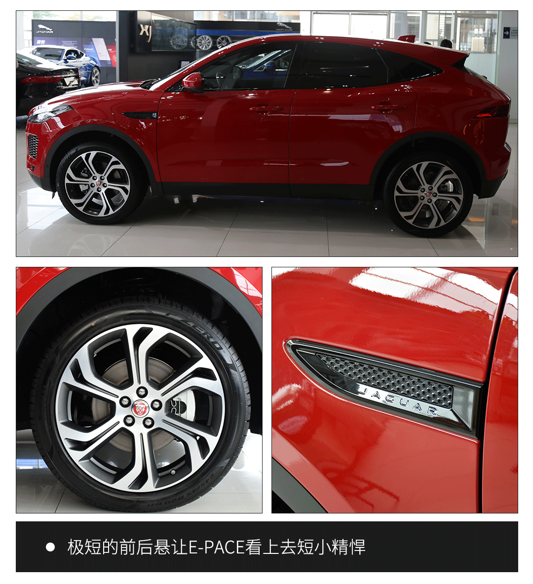 侧面看,E-PACE的20尺寸轮毂十分有运动感,而且前悬和后悬非常短,轮子仿佛就安装在车身最边边的四个角上,加上车长较短,整体显得短小精悍,这样的设计会让它的掉头转弯十分灵活,不容易发生剐蹭,对女司机和新手是一件好事!