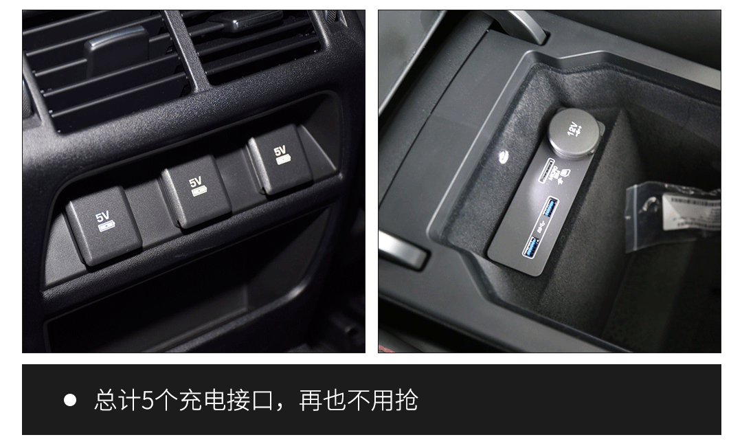 前排提供两个充电接口,后排则有三个,这样车上就算坐满5人,每个人都可以为手机充电了
