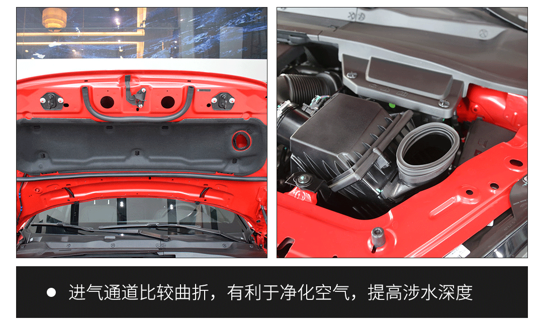 进气系统布局较为新颖,空气从中网前方吸入,再通过发动机盖上的通道,然后流入朝上开口的进气口,最后进入空滤,估计这样曲折的进气通道是为了更好隔离空气中的渣滓杂质,同时也有利于提升最大涉水深度。