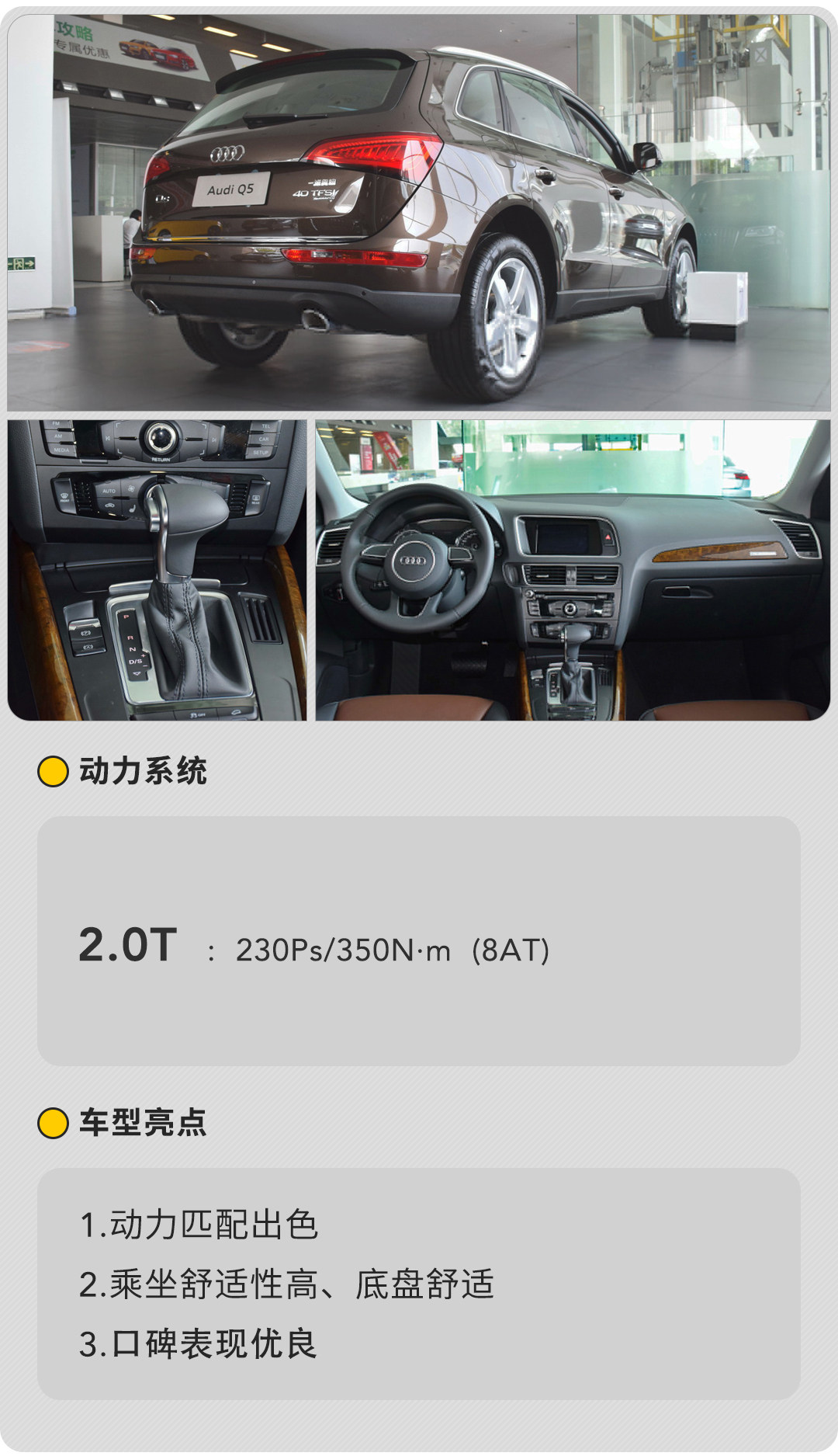 而且奥迪Q5搭载了表现突出的动力总成+全时四驱驱动系统,动力强劲油耗又不高,百公里加速7秒多加上纯机械式的托森差速器全时四驱,不仅反应速度快,可靠性也颇为到位!