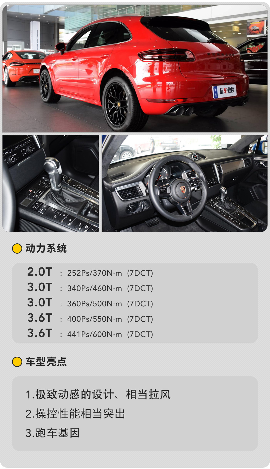 拥有跑车血统、兼具操控感受和实用性的保时捷-Macan应该是很多朋友心中的理想汽车!它作为一款豪华运动中型SUV,入门车款上的2.0T发动机能输出252Ps最大马力,配合7挡双离合,其零百成绩也可做到6.7s,加速成绩优于许多钢炮。在转向的调校方面,Macan轻重适宜、路感清晰,驾驶感相当突出!