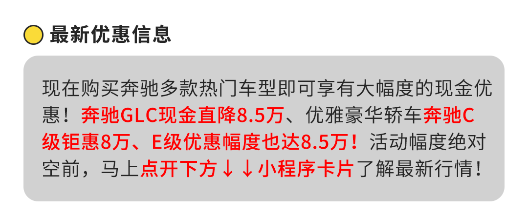 车型点评:奔驰GLC的内外设计体现出颇高的豪华气质,车内金属质感的细节提升了整体的气质,皮质+缝线的中控台顶部材质手感也很出色,材料和细节做工都很考究。而且现在优惠幅度高达8.5万,产品竞争力表现出众!
