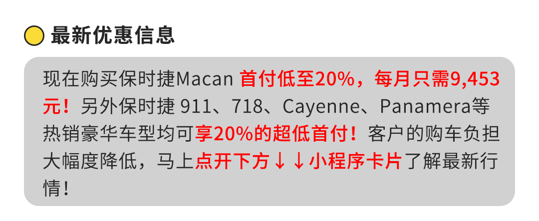 车型点评:保时捷-Macan无论是在动力输出表现还是操控性能上,在同价位车型中基本难觅对手!而且在城市中穿行它实用性高也相当拉风,而现在享有超低首付的优惠政策,购车也变更加轻松。