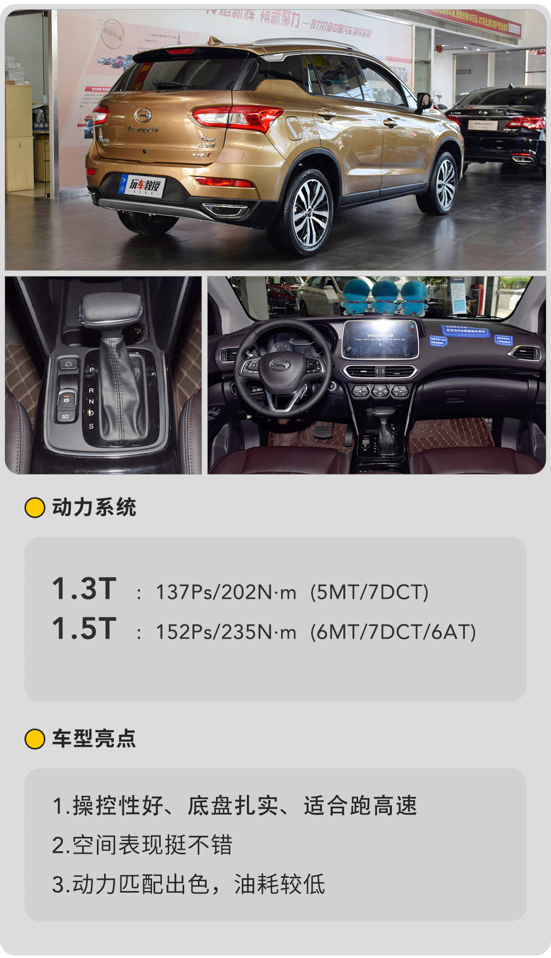 车型点评:传祺GS4的定价颇具吸引力,并且给出的优惠方案也直接降低了用户的购车压力。它的底盘表现可控性高,操控极限也清晰,在较高速过弯时,悬挂也能有充足的支撑力,配合不错的动力系统操控感受较为出色!