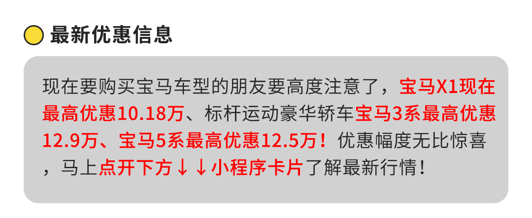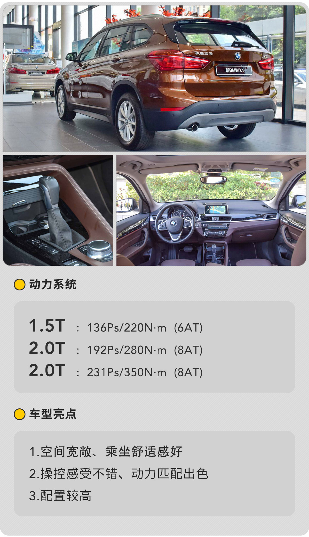 车型点评:宝马X1的转向精准、底盘表现均衡性好,配合调校出色的动力总成,车主在单人驾驶时可以纵情享受它的驾驶乐趣!并且现在它的最高优惠高达10.18万元,性价比和竞争力无疑是相当突出的!