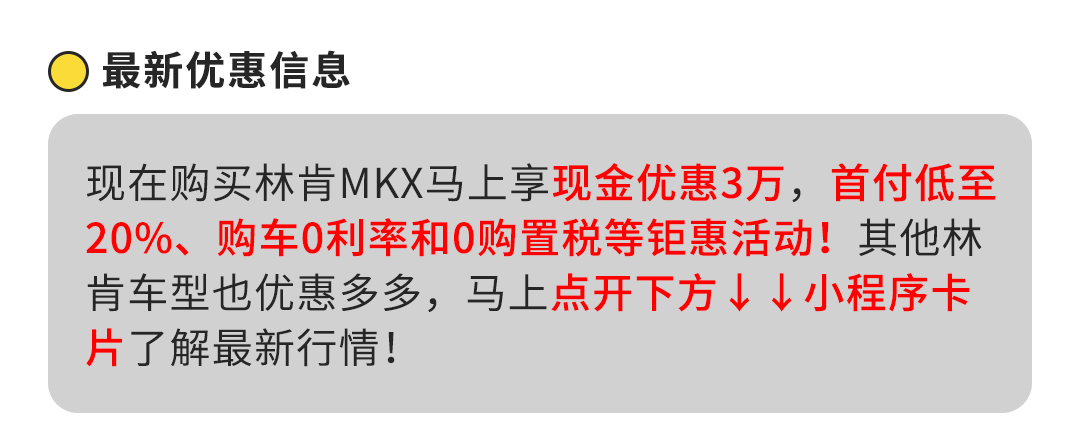 车型点评:林肯MKX在豪华中大型SUV市场中则凭借着高大的车身尺寸、空间,独特的外形,强劲的动力以及独到、带有科技感的配置赢得市场。而且它目前给出的优惠也颇为实在,性价比表现还是相当突出的!