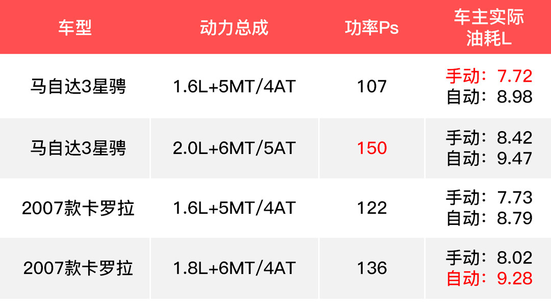 在上面的表格中,我们能直观看到,2.0L的马自达3星骋的马力值和自动挡变速箱的挡位数都是最突出的,而车主反馈的实际油耗方面它们表现接近。