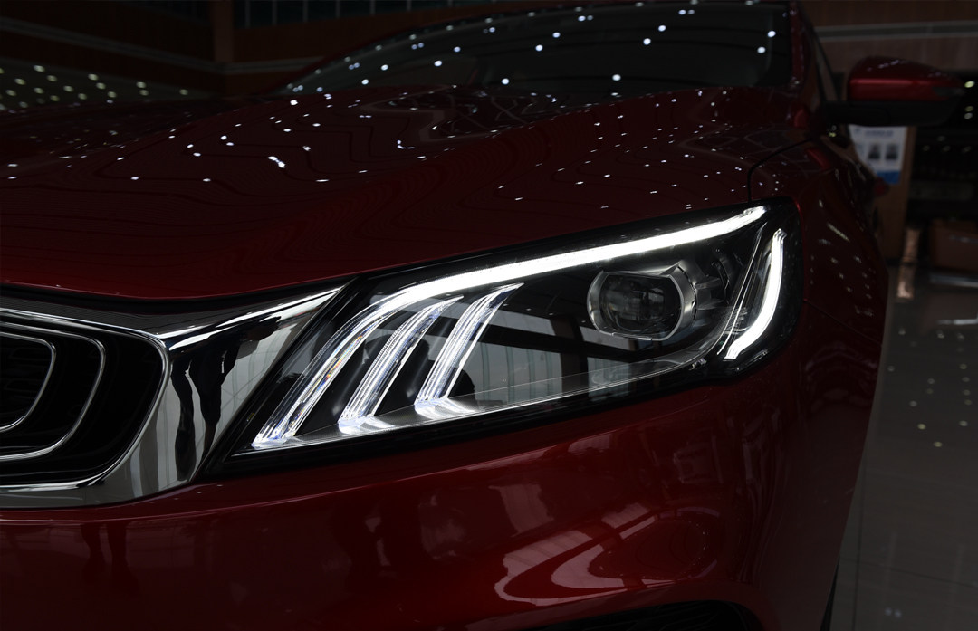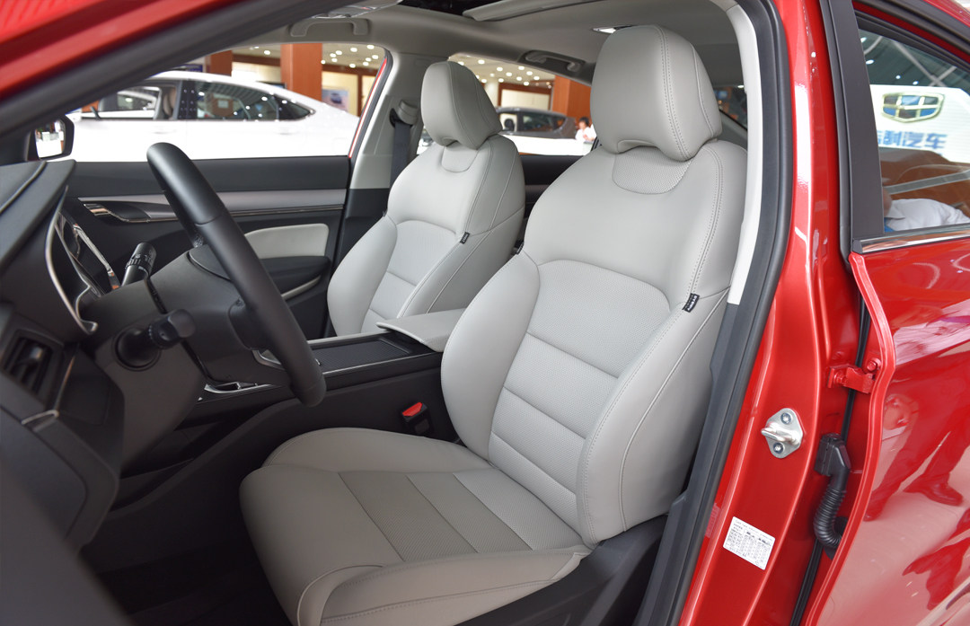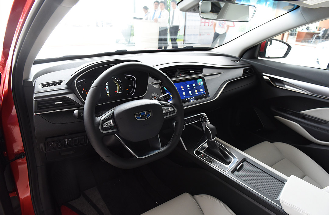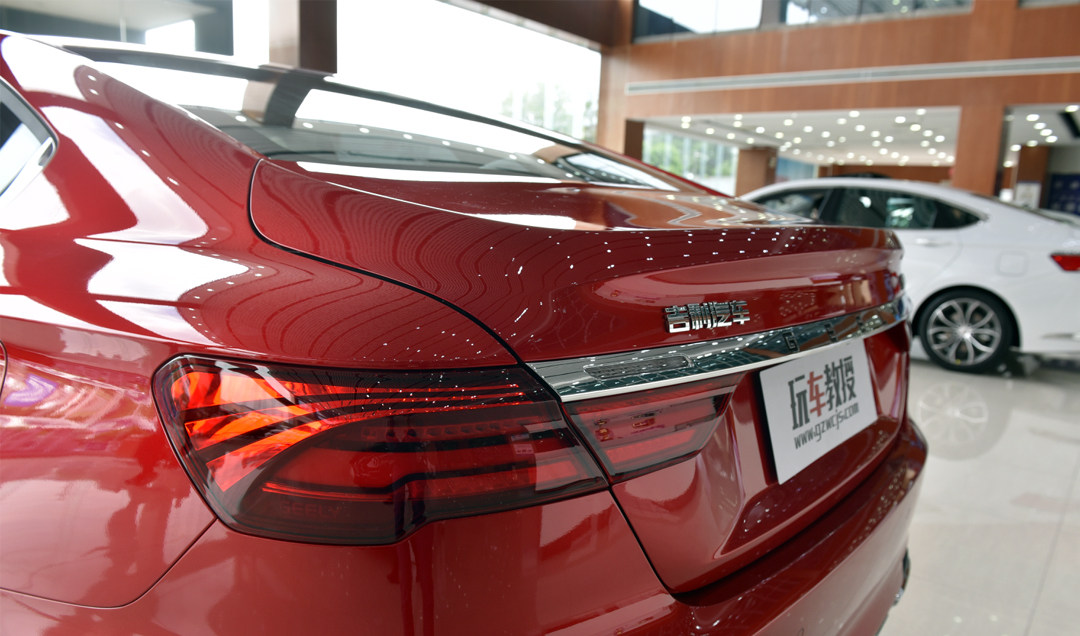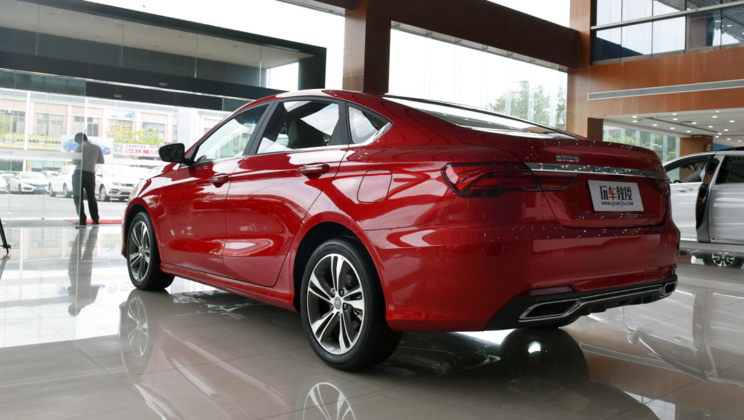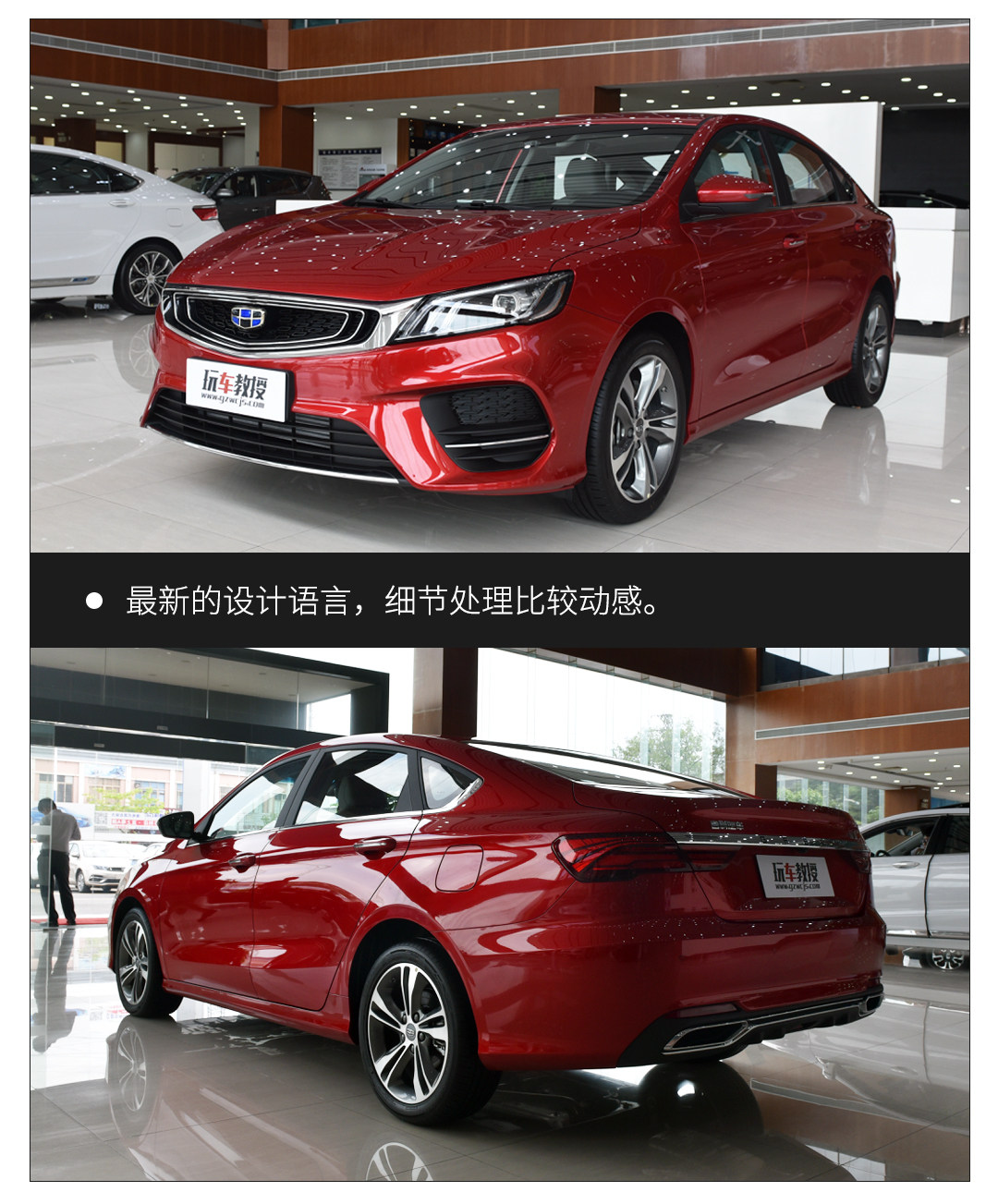 它采用吉利最新的家族化前脸,布局很规整、协调,而且运动感表现较强,前包围左右两侧带有类似进气口的造型,当然它是封死的,但动感气息不错。