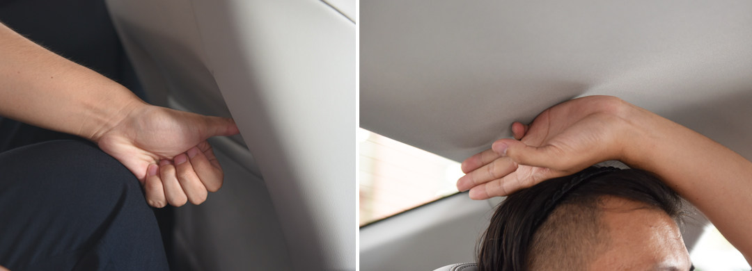 进入到后排,坐姿舒展,体验者能得到约1拳2指的腿部空间,头部空间约4指。