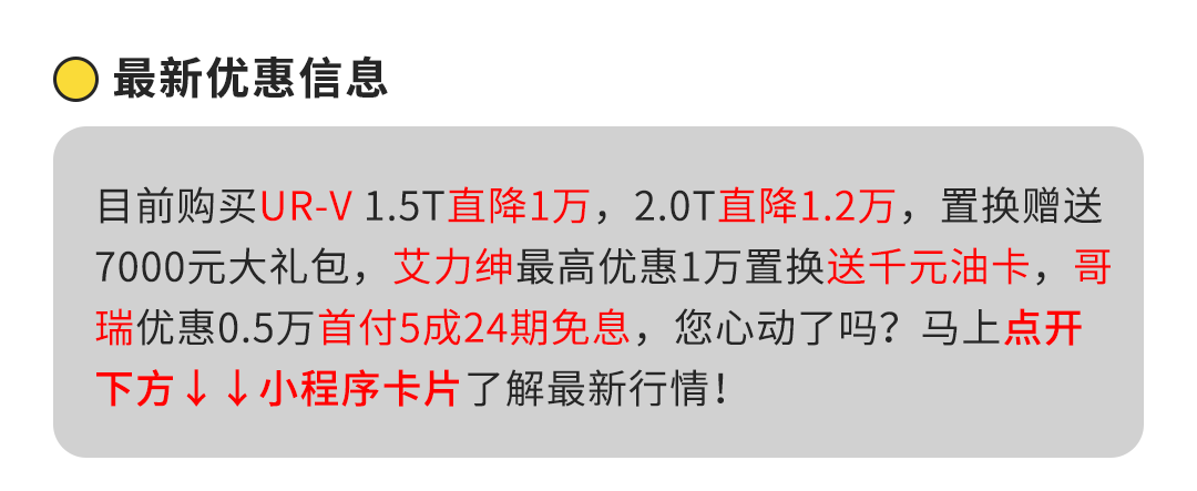 适合人群:如果您喜欢相对年轻动感的外观内饰,注重动力和操控性,那就赶紧去看看UR-V吧!