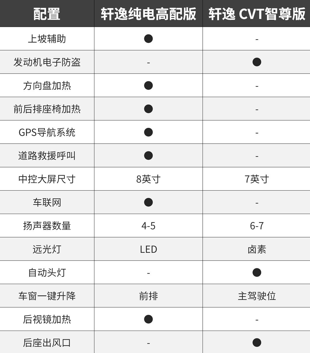 从上表能看到,即使是对比普通轩逸的顶配车型,轩逸纯电依旧有一定配置上的优势。像LED远光灯和前排车窗一键升降这些配置都是挺实用的,不过后排出风口的缺失还是不太应该。