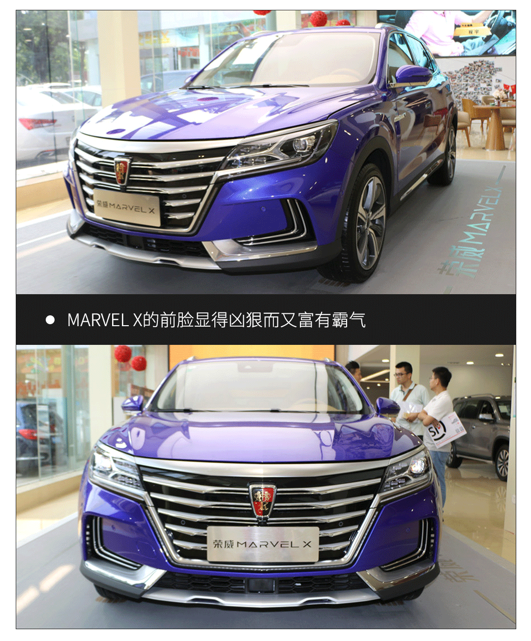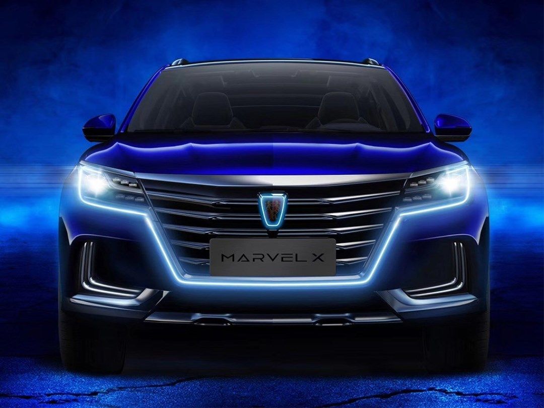 荣威MARVEL X的前脸设计凶狠而又富有霸气,配合中网上横向的镀铬装饰条和保险杠两侧獠牙状的通风口,显得极具攻击性。中网下方上的LED日间行车灯与两侧大灯连为一体,夜晚点亮十分漂亮!(效果如下图)