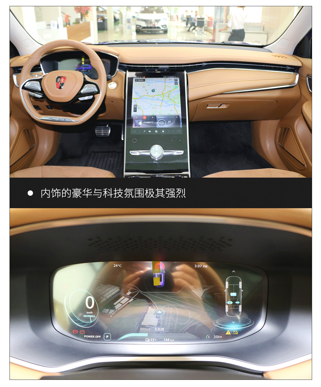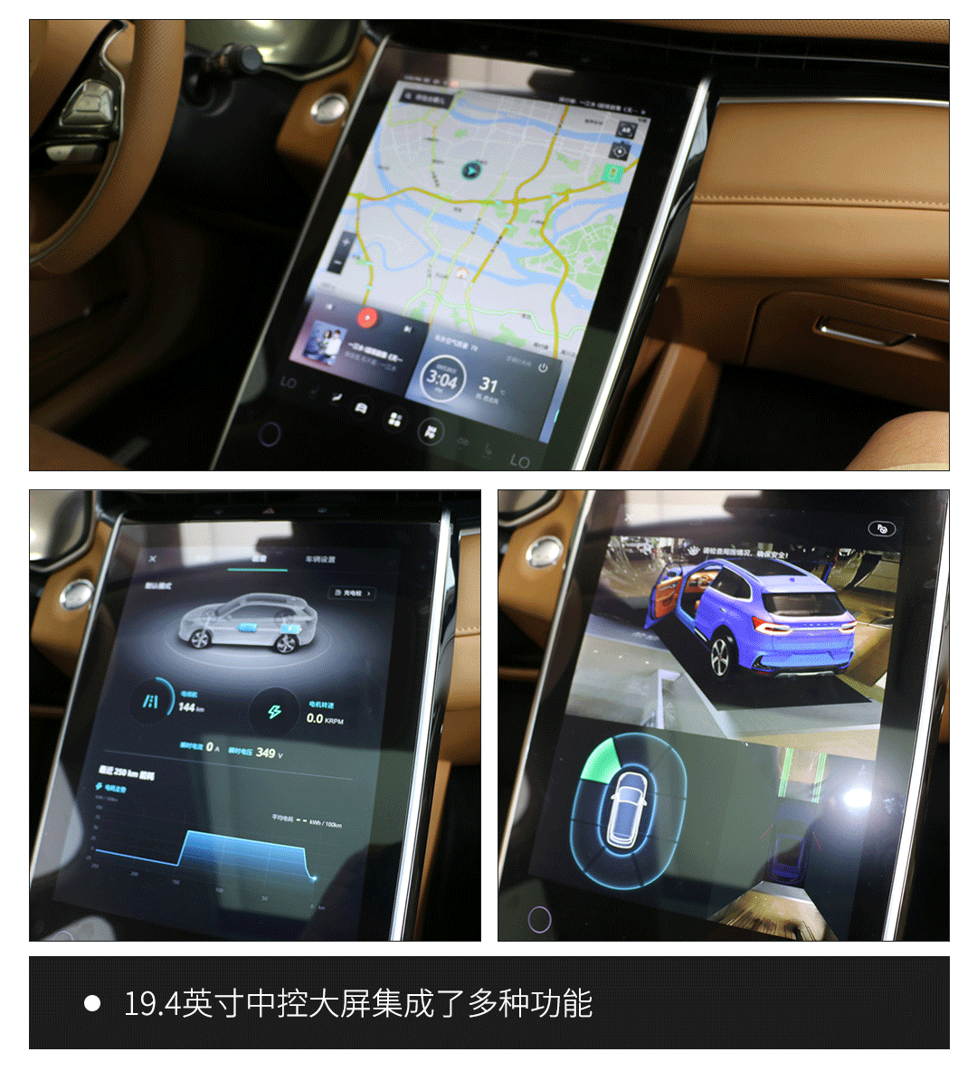 荣威MARVEL X这个19.4英寸的中控屏相比特斯拉Model S的中控屏,在尺寸和功能集成度上可以说有过之而无不及,不仅分辨率很高,触摸反应灵敏,而且菜单逻辑清晰,能够显示导航、电池电量、电机工况等信息,并使用空调、音响、360度环视摄像头等诸多功能。