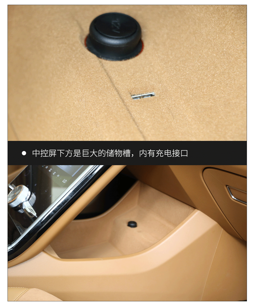有与中控屏幕倾斜角度很大,因此下方的三角区留出了一个很大储物槽,就算放下pad这些大尺寸电子设备也没有问题,而且上面还有12V和USB充电插口。