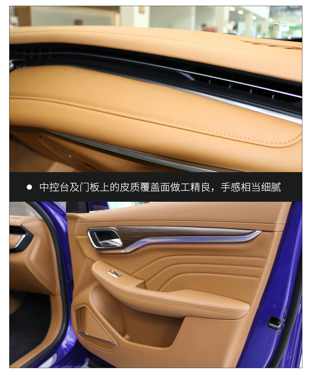 MARVEL X的内饰做工和用料同样出色,中控台被大面积的皮质和软性材料所覆盖,车门板上能被手臂接触的地方也全部被皮质材料包裹,手感柔软细腻,绝无突出的线头和喇手的毛刺。