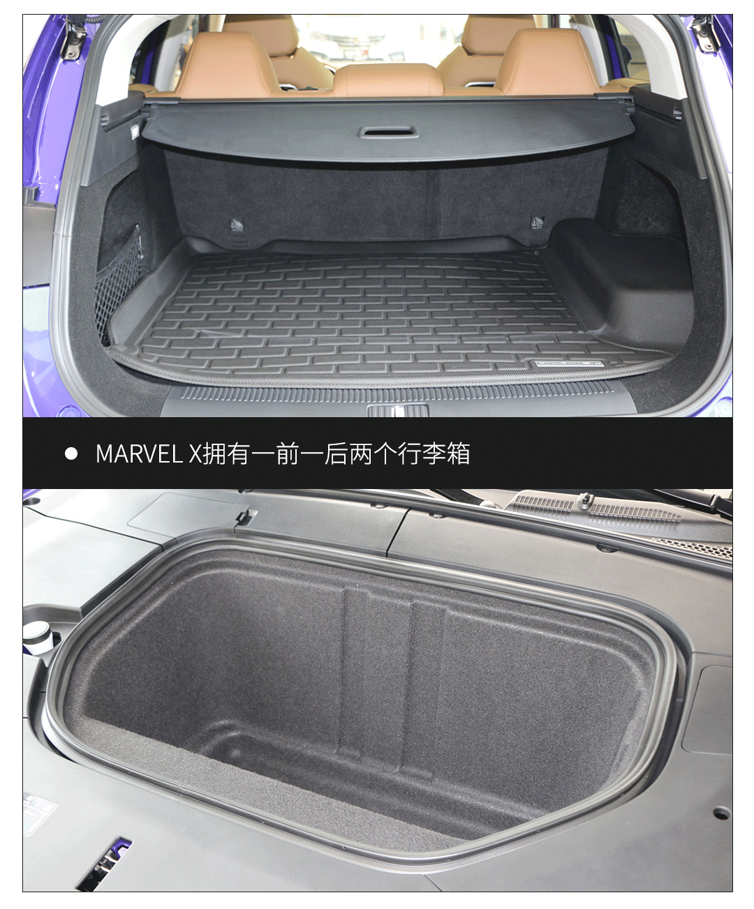 由于电机分别位于前后桥上,因此传统燃油车发动机舱的位置在MARVEL X上就变成了一个容积巨大的前备箱,深度足以放下一个20寸行李箱。