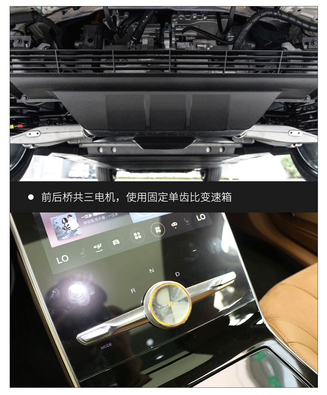 实拍的MARVEL X全驱版采用了前桥单电机+后桥双电机的三电机布局,总功率302马力,总扭矩665牛米,零百加速仅需4.8秒,参数不可谓不惊人!而与电动机匹配的是固定单齿比变速箱。