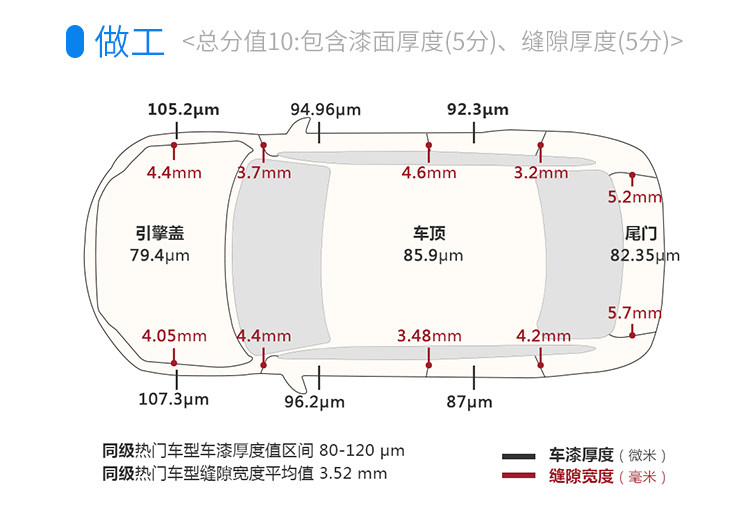 欧尚A800的车身做工还是可以的,钣金缝隙虽然不算窄,但是还是比较均匀,不过车漆厚度有些偏薄了,平均不足100μm的车漆面对树枝等物品时还是有些担心。