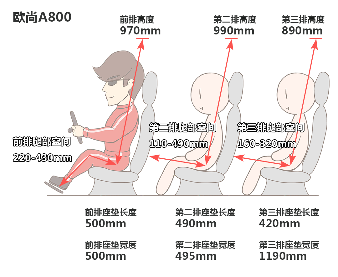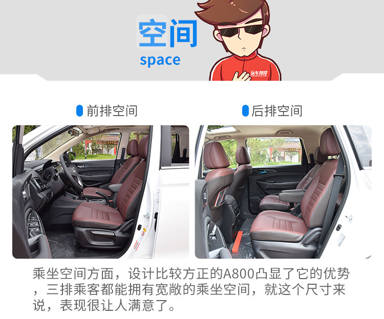 相比较竞品车型,欧尚A800的优势主要是在长度和高度上,对于一台MPV来说,更高的高度意味着更好的视野和头部空间。