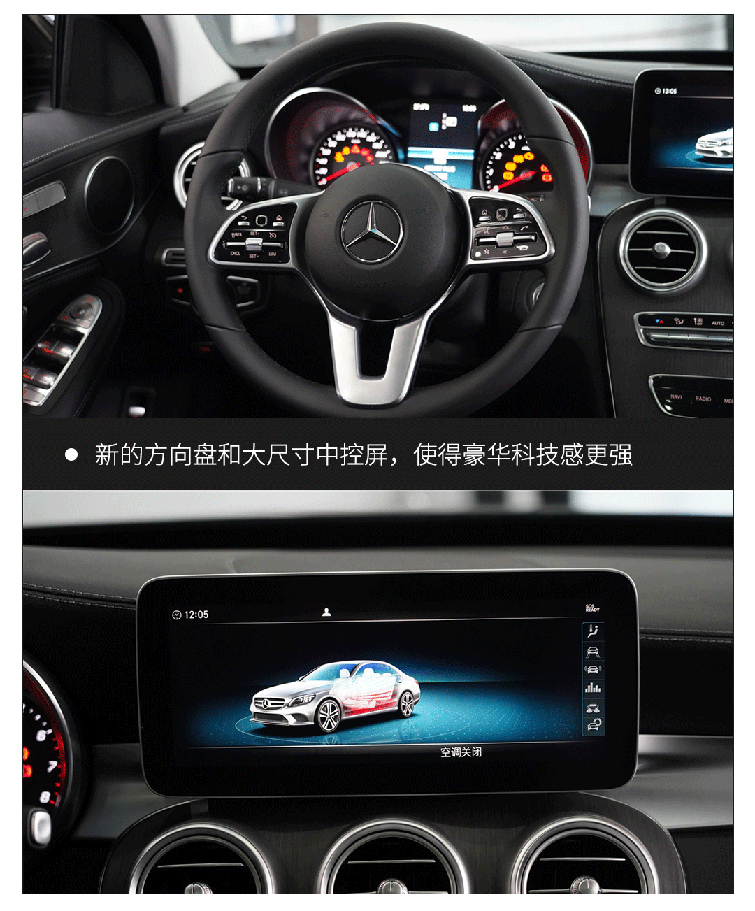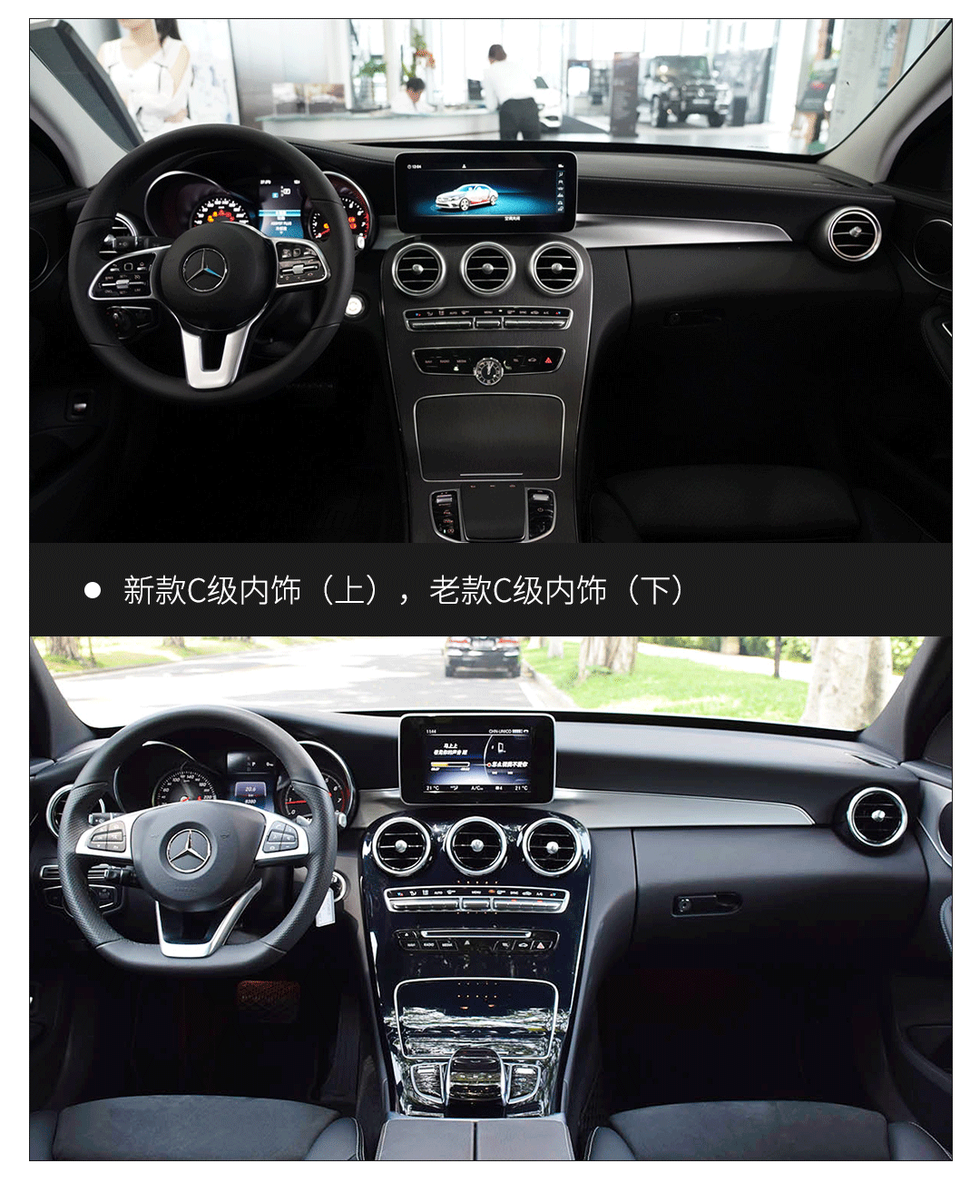 内饰上相比老款的区别就相对明显了,比较容易察觉的就是新款样式的方向盘,相比老款更加粗壮,功能按键更多,豪华感更加强烈。其次就是悬浮式中控屏从7英寸升级到10.25英寸,给人以浓浓的科技感。不过遗憾的是新C级没有采用E级和S级霸气的双连屏设计,依然是老款的双炮筒机械仪表,如果能在下次改款或换代用上双连屏就更好了。