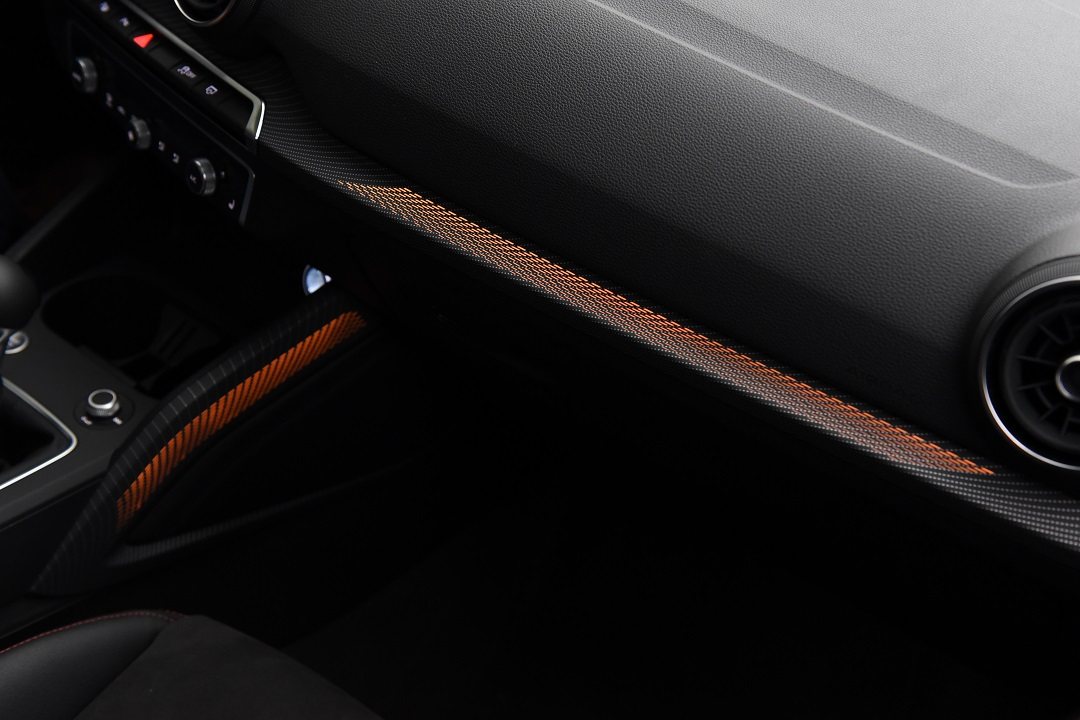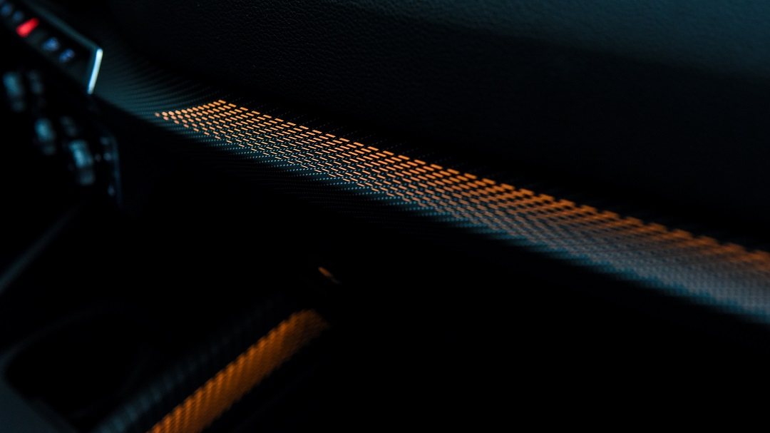 亮点在奥迪“灯厂”玩灯玩出了新境界,从外边玩到里边去了,采用了新式的炫彩氛围灯,由无数个条形光斑交织组成,和饰板纹路交织在一起的氛围灯,这还是非常少见的,而且是10色可调,20种色度可调,布置在手套箱上方和挡把区两侧,科技感十足。