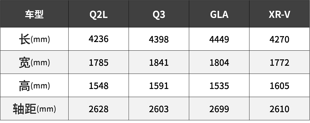 众所周知,中国人对小车不大感冒,所以Q2L的轴距比海外车型增长33mm,加长后达到了2628mm。而Q2L的长宽高为4236(4229致雅型)*1785*1548mm,为讨中国消费者欢心,大众集团加长这一招一直都是屡试不爽,但是这次只加长33mm,是否“象征性”地增加而已呢?