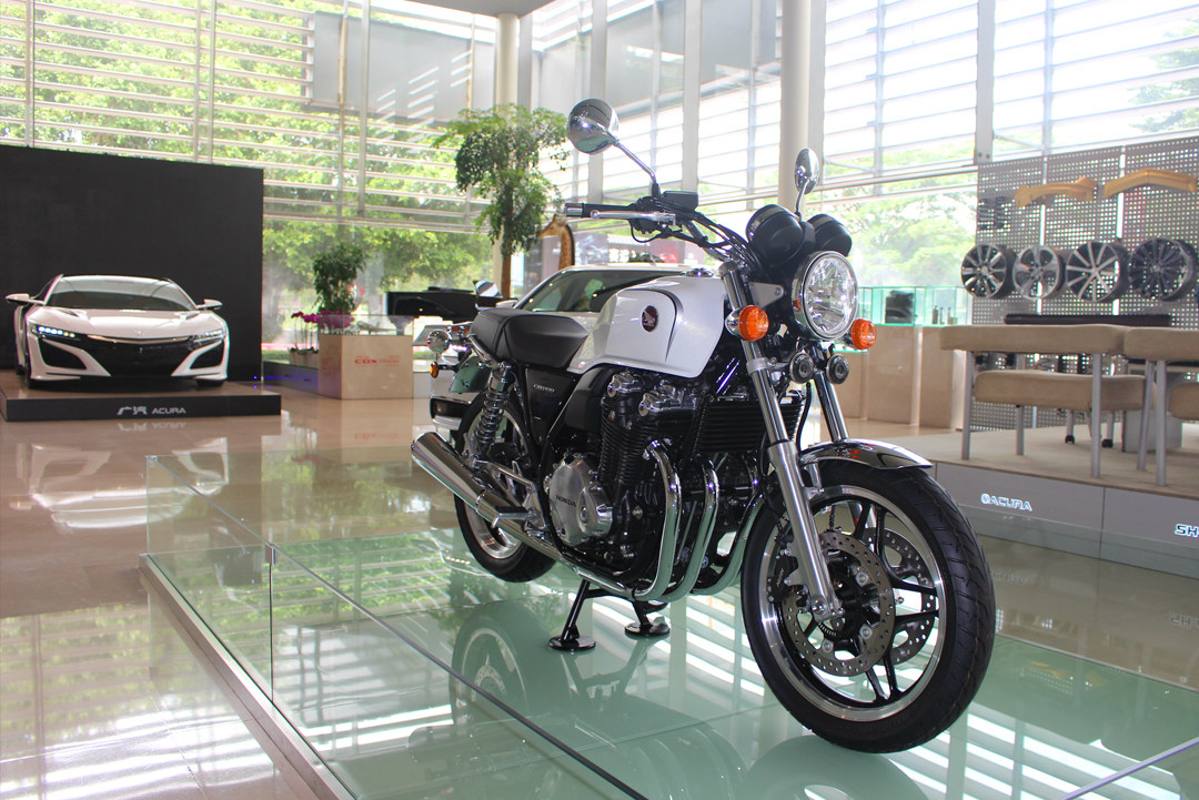 展厅上有一台本田CB1100,功率不算特别大,但它玩的是复古机车范,教授大爱!它用的是直列四缸风冷四冲程发动机,摩托车都在坚持四缸,现在汽车则走去玩三缸......而后方停着一台讴歌NSX!
