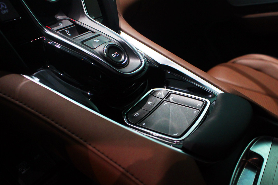 下方按键式换挡按钮的设计个性化突出,而在换挡区域下方是教授比较欣赏的多媒体触控板,它竟然支持“绝对定位”功能,手指触控的位置能和屏幕上的位置相对应,还具有手写功能,习惯以后很是便利!