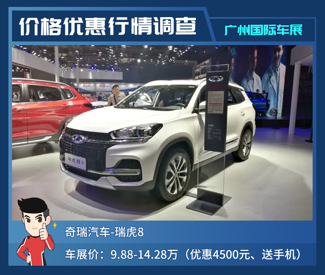 瑞虎8在广州车展上全系优惠4500元,订车还赠送手机一台。并且教授了解到目前5座豪华版车型最畅销,国五车型订车需要一个月,国六车型需要两个月,手动挡车型暂不排产。