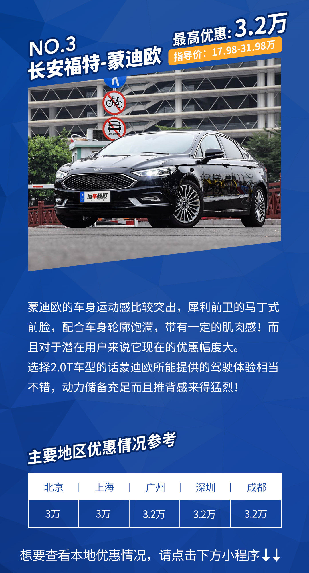 优惠详情:蒙迪欧在北京地区仅需在店内上保险,上海、广州、成都地区为现金优惠,在深圳需要店内上保险、店内贷款。