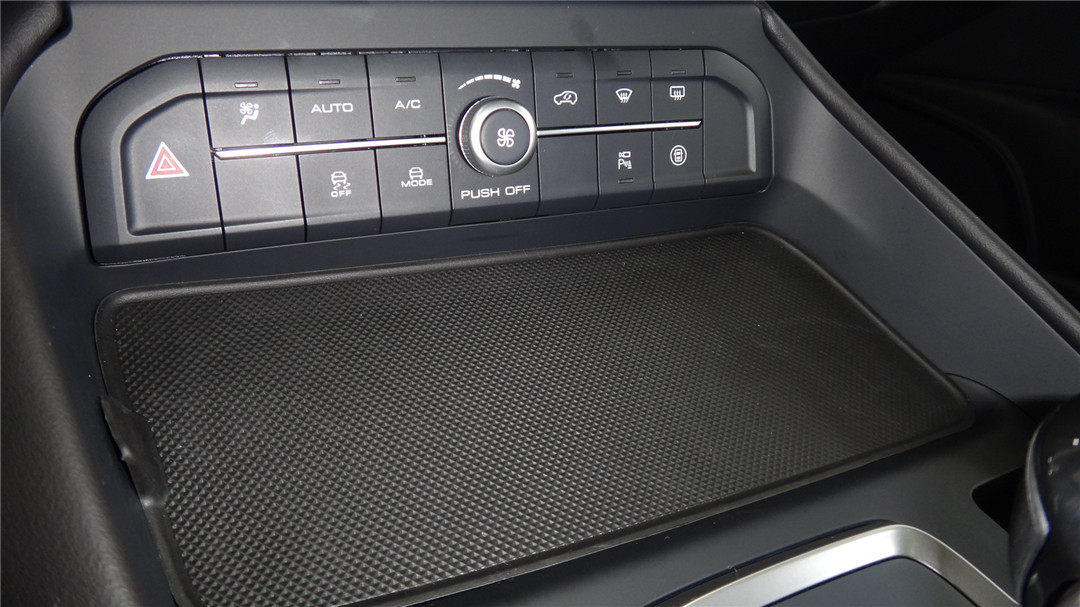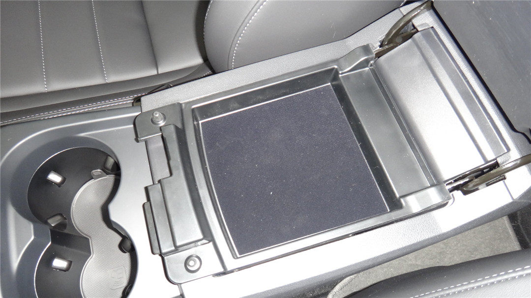 挡把前方位置是空调系统的实体按键以及一个储物槽,这个储物槽刚好可以放手机,不过我们拍摄的中配车型不具备高配车型的手机无线充电功能。