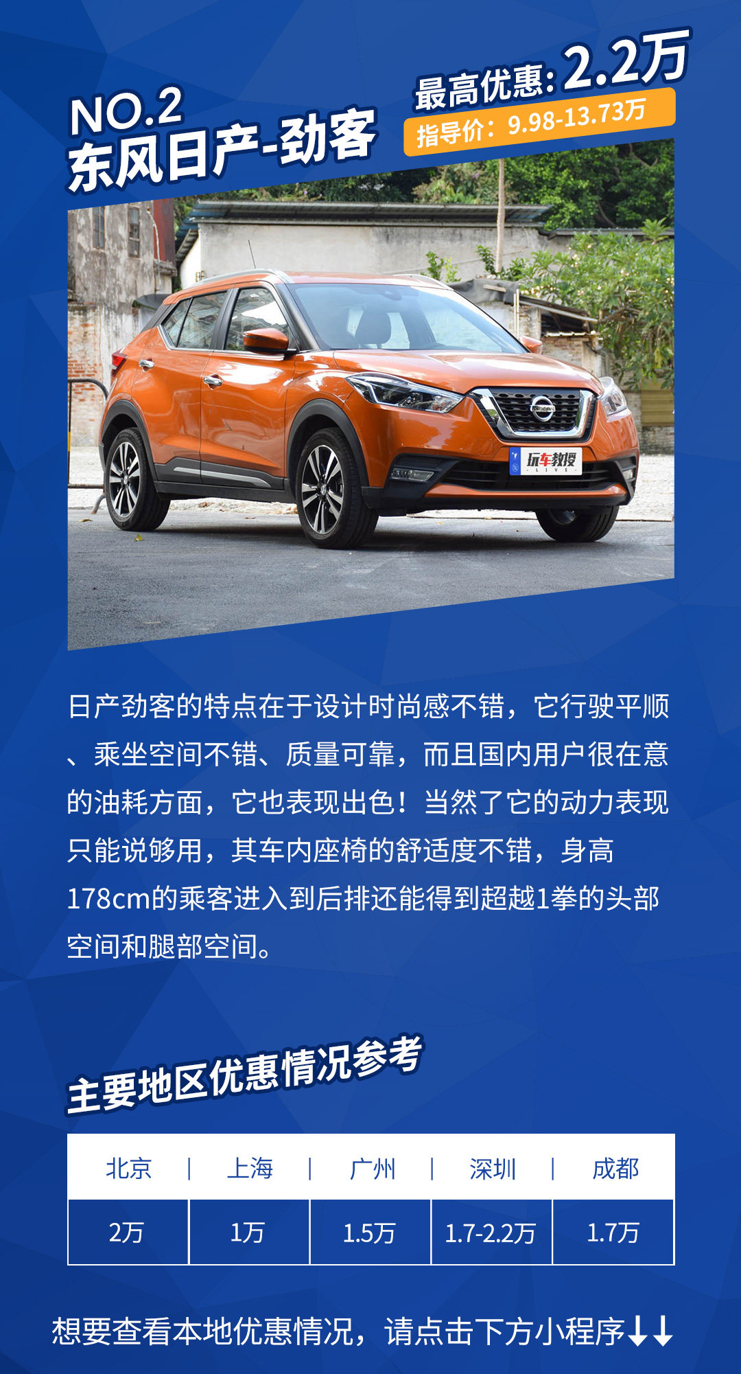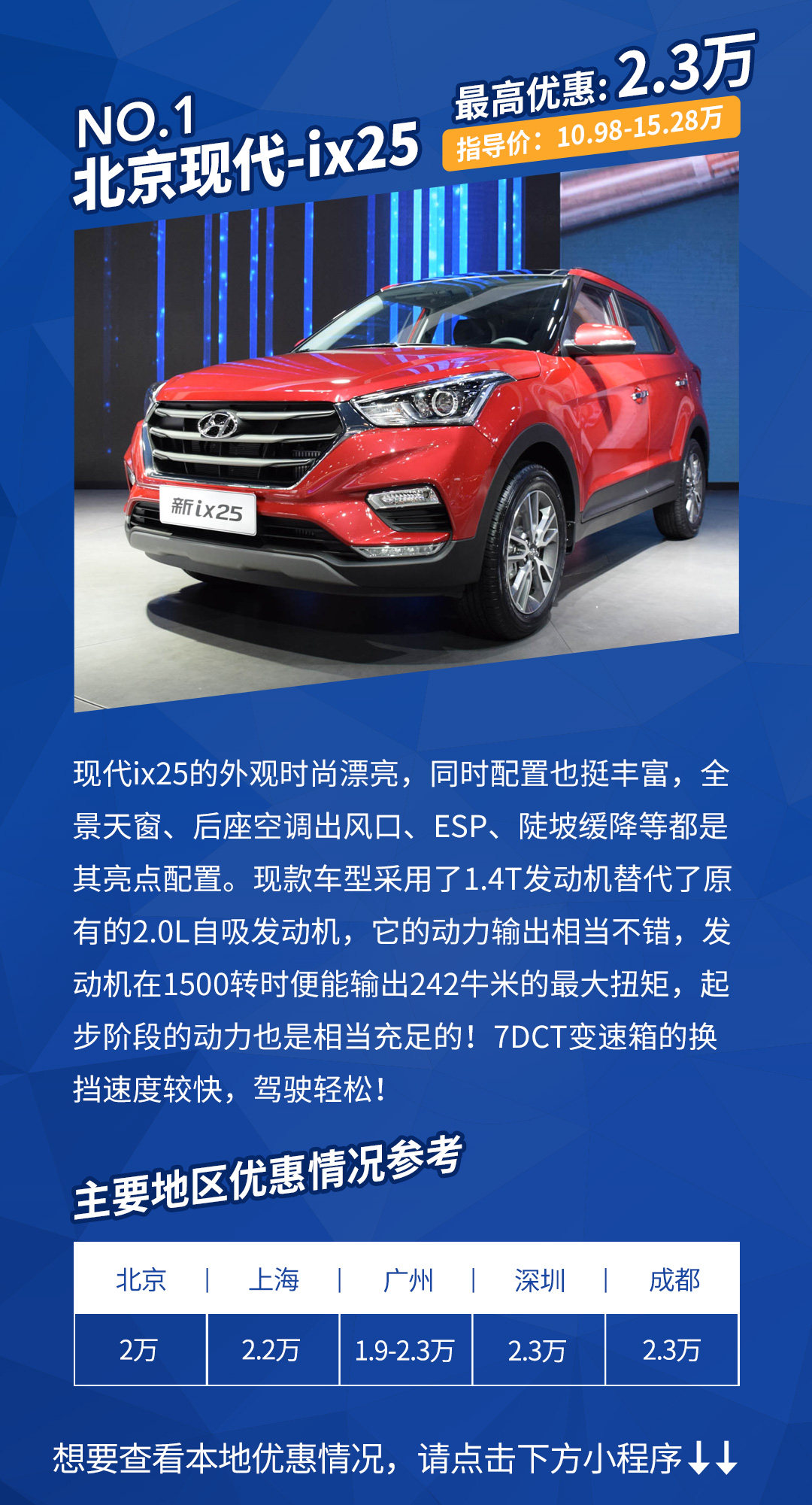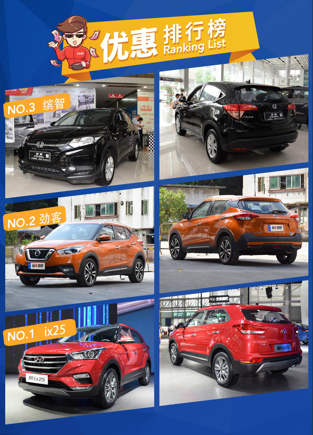 今天给大家推荐的这几款车型都在最近给出了大幅度的优惠,其中小型SUV阵营里日产劲客、现代ix25在优惠过后的性价比表现很不错。而家轿市场中别克英朗、雪佛兰科鲁兹的优惠幅度已经相当给力,性价比突出!