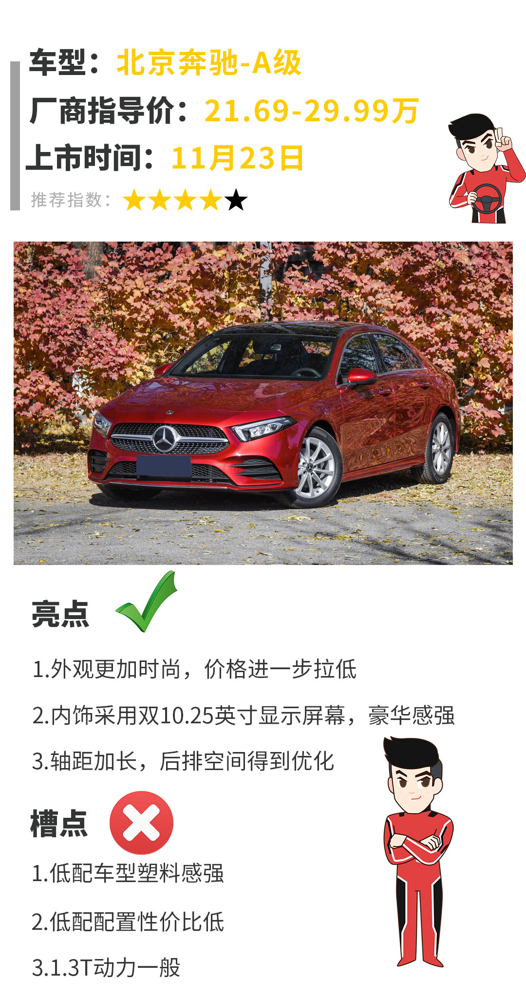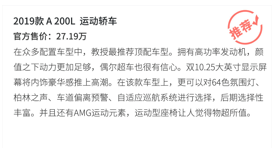 小结:作为奔驰的一款入门轿车车型,A级的产品力不毋庸置疑的,除了平台生产之外,奔驰的一些新技术都运用在A级身上。比如全新10.25英寸双液晶显示屏,显示效果酷炫,也带来很高的实用性;而在人机系统上,全新A级也匹配上了MBUX双拇指控制系统,以至于很多消费者都会误以为这车型比C级还要高级。关键的是,在物以大为美的市场消费情况下,A级的轴距达到了2789mm,后排空间足够优秀。至于动力,够用就好,不要太挑剔。