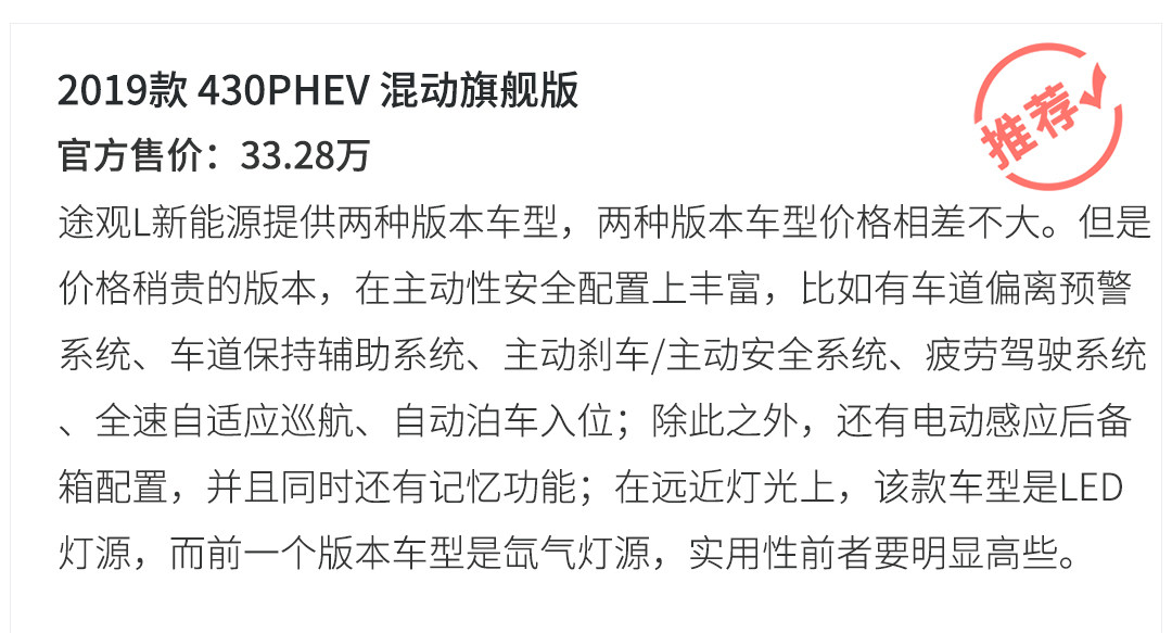对于一些限行城市的消费者而言,途观L新能源非常值得去选择。首先,在同级别车型中,几乎没有直接的竞争对手;其次,插电式混合动力及消费者对途观L固有口碑的印象,与消费者需求非常贴合。在补贴后,两款车型的价格分别为28.98万和29.98万,售价非常接近。