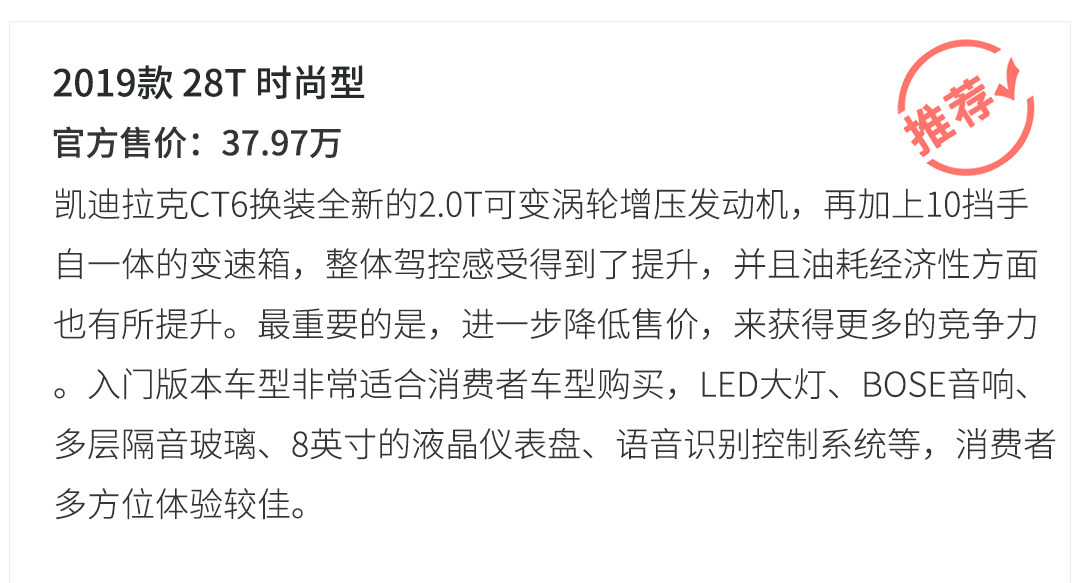小结:CT6,原先是将7系作为直接的竞争对手,由于品牌力的因素,CT6只好转战与5系、E级、A6这些车型进行较量,利用错位竞争来获得更多的市场份额。新一代CT6已经足够豪华,而44mm的车身尺寸优化,又再次验证了消费者对“大”的喜好。除了车身尺寸外,“大”也表现在动力上。对于越来越严格的排放标准,以及消费者对油耗上的重视,新CT6在动力总成上大刀阔斧。全新2.0T可变缸技术涡轮增压发动机,在满足国六的排放标准下,CT6脱去油老虎的帽子,这一切还得靠闭缸技术来完成。而在传动方面,CT6也全副武装了通用集团的10速自动变速箱。两者默契配合,在更低的油耗排放时,还能提供更有效的动力输出。