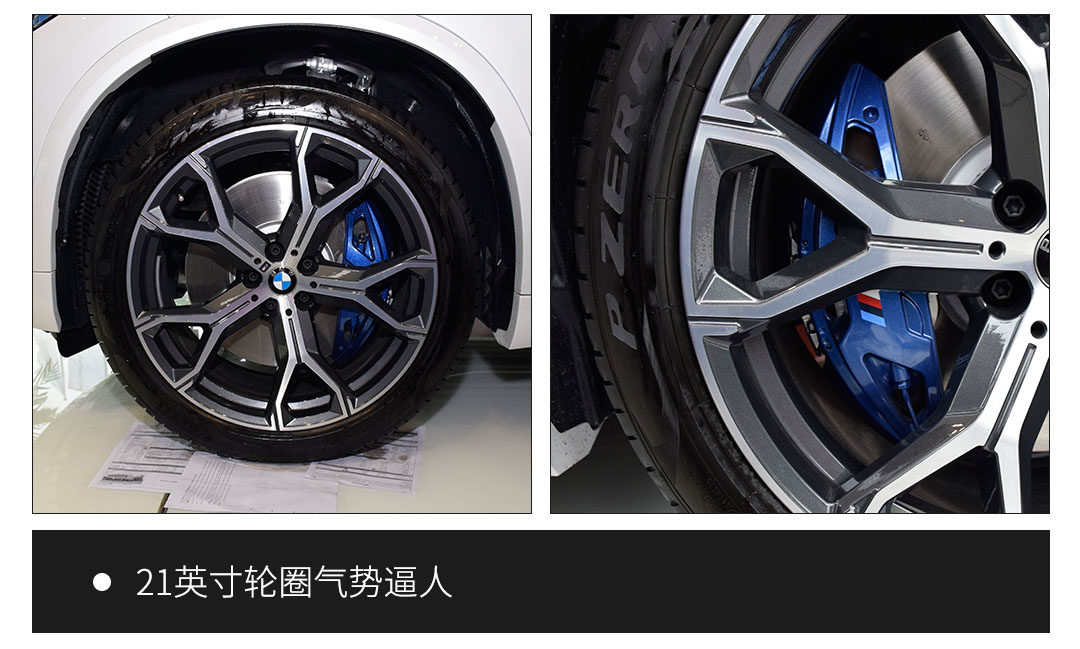 21英寸轮圈与X5高头大马的形象组合相得益彰,而作为车身唯一与地面接触的物体,轮胎的选择变得尤为重要,尤其是以主打性能的车型。选用的倍耐力P ZERO轮胎,前轮规格为275/40 R21,后轮规格为315/35 R21。宽轮胎的设定和M Performance刹车套件的加持下,稳定性、抓地力和刹车性能都得到了保证,从而为运动奠定了坚实的基础。