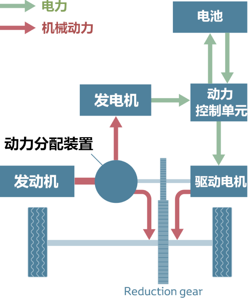 THS II是典型的功率分流混合动力系统,这种结构没有固定的挡位也不属于传统的变速箱,但是丰田还是把它称作E-CVT(动力分配装置),其实想表达的意思就是无缝调节电机与发动机之间的转速比。THS II也有两个电机,而且这两个电机通过行星齿轮(动力分配装置)与发动机结合在一起,发动机的转速与电机转速比并不是固定的,因此可以根据工况选择发动机和电机的动力分配比例。