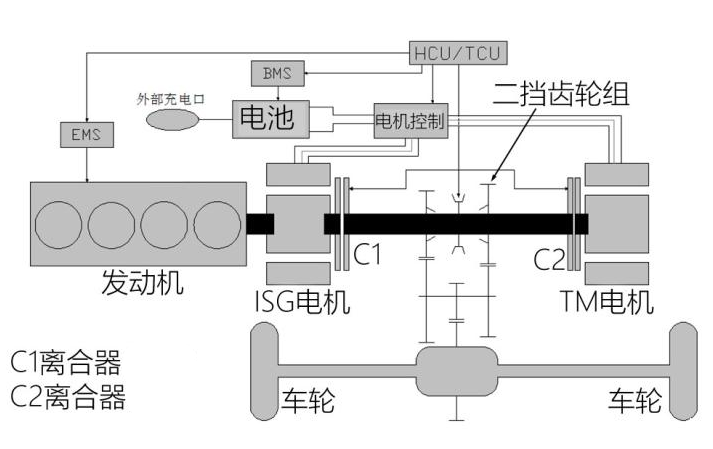 荣威ei6并没有传统变速箱,发动机的曲轴集成了ISG电机,它的功能与秦Pro DM是一样的,只是布置位置和功率不一样。在ISG电机和驱动电机之间各有一个离合器,两个离合器之间是一个类似手动挡变速箱的两挡齿轮。ISG电机侧的离合器断开,发动机就能单独带动ISG电机发电,然后把这些电能提供给驱动电机,这样就是串联模式。如果两个离合器全部结合,发动机和电机一起驱动就成了并联模式,如果驱动电机侧的离合器断开,那么发动机就可以直接驱动。