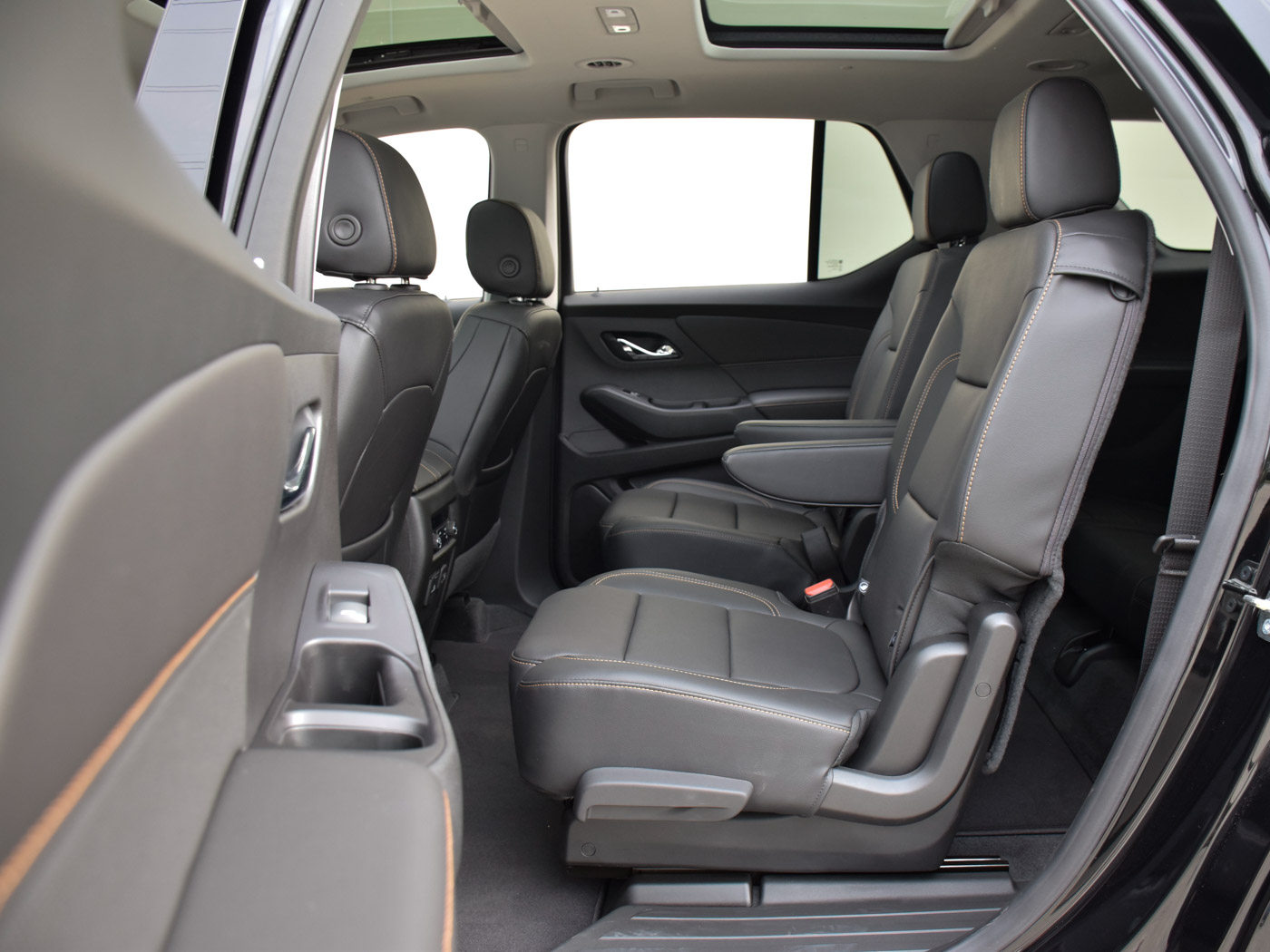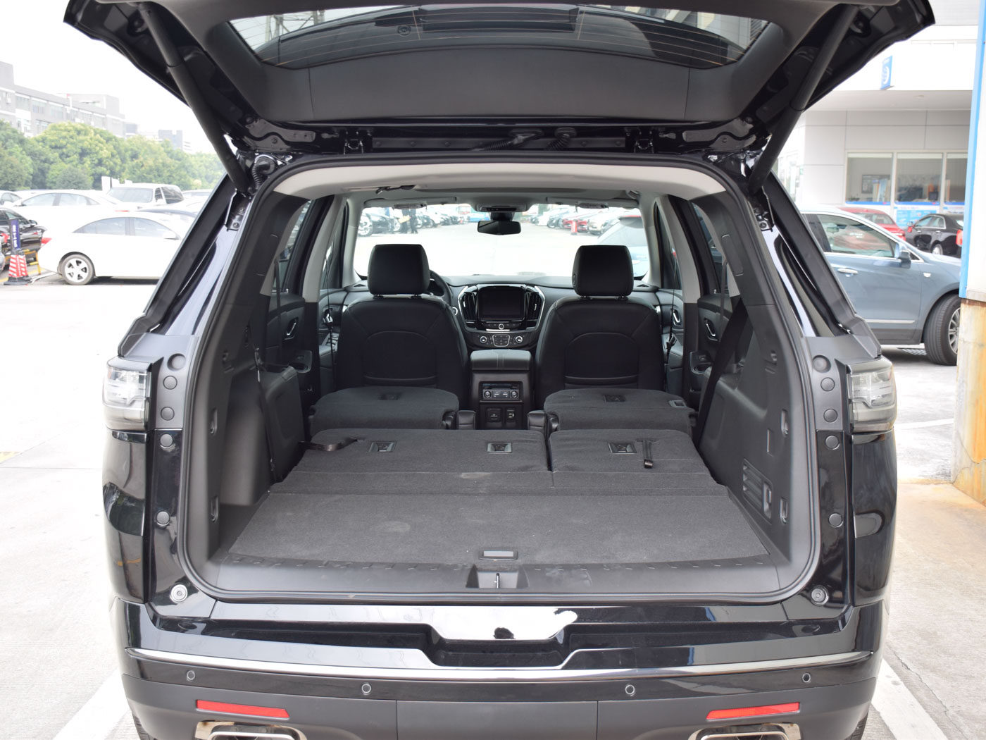 后备箱空间表现出色,配一键放倒座椅的电动按钮。即使不把座椅放倒,也可以放下好几个大箱子。第三排放倒之后整个人躺进去也不是问题。